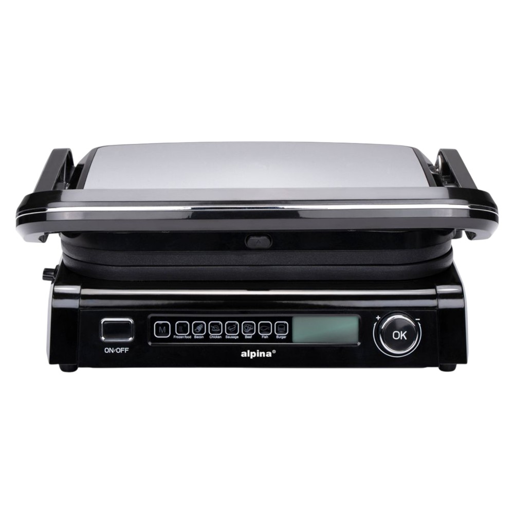 Me këtë grilë skarë shumëfunksionale nga Alpina ju mund të përgatisni shumë produkte të ndryshme në një mënyrë të thjeshtë. Falë mënyrave të ndryshme të skarës dhe mënyrës së gatimit inteligjent, pjekja në skarë bëhet shumë e thjesht për të gjithë. Pllakat e pjekjes janë të pajisura me një shtresë që nuk ngjit dhe secila ka një sipërfaqe prej 32 x 25 centimetra. Ato mund të mbyllen së bashku dhe të përdoren si prodhues sanduiçësh ose grill për panini, ose mund të kthehen në një kënd prej 180 ° për sipërfaqe shtesë horizontale. Kjo pajisje për skarë ofron një gamë të gjerë mundësish falë zgjedhjes së 7 pozicioneve të ndryshme të skarës, nga ushqimi i ngrirë dhe peshku deri te hamburgerët dhe proshuta. Butonat në pjesën e përparme të pajisjes janë të pajisur me ikona të dallueshme për përdorim të lehtë. Duke zgjedhur një pozicion specifik të skarës, pajisja e skarës përshtatet me temperaturën dhe kohën më të mirë për atë produkt ushqimor specifik. Mund të lexoni në ekranin dixhital kur grila të jetë gati. Ju gjithashtu keni mundësinë të vendosni vetë temperaturën dhe kohën nëse preferoni të mos përdorni një nga programet e para-programuara.