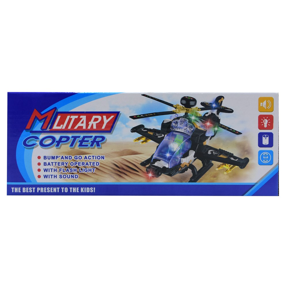 Helikopter ushtarak lodër për fëmijë, prej materiali plastik, me drita në ngjyra të ndryshme dhe me muzikë, i pajisur me një sistem lëvizjeje që e bën të ndryshojë drejtim nëse përplaset me një pengesë. Punon me 3 bateri 1.5 V të tipit AA, të cilat nuk janë të përfshira në paketim. Kjo lodër ndihmon në zhvillimin e imagjinatës, zhvillimin e shqisave dhe zhvillimin e aftësive të të mësuarit dhe të perceptimit tek fëmijët. Materiali përbërës dhe boja nuk kanë përmbajtje toksike apo të dëmshme për fëmijët dhe produkti është i çertifikuar për siguri në përdorim. Ky produkt është i përshtatshëm për përdorim nga fëmijë të moshës mbi 3 vjeç.