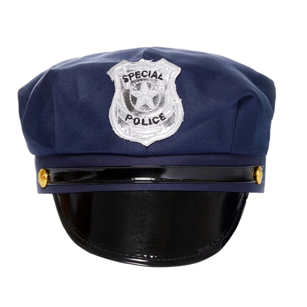 Kapelë policie në pëlhurë blu, me dekor argjendi dhe polici "Special Police" në PVC të zezë me shkëlqim dhe të ngurtë. Një madhësi e cila përshtatet për të rriturit.