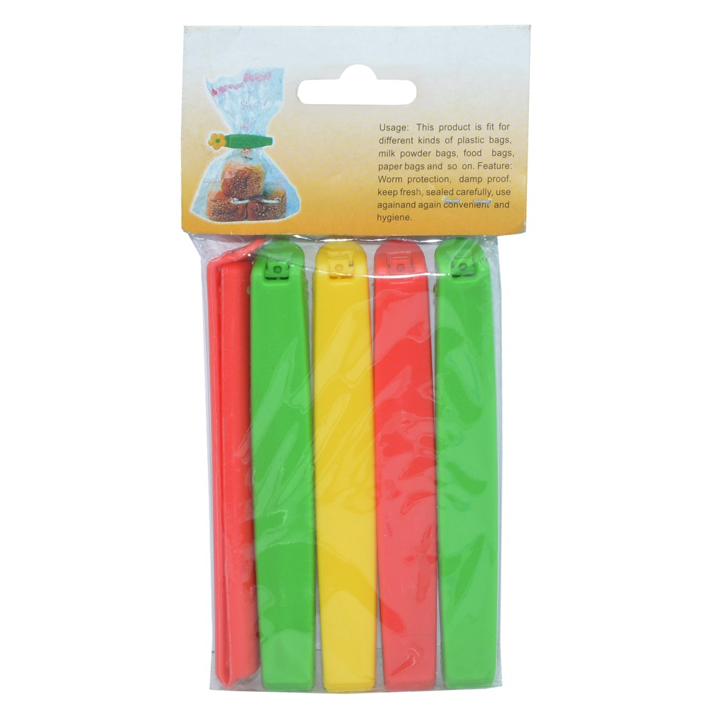 Kapëse plastike, 5 copë, shumëngjyrëshe, që shërbejnë për mbylljen hermetikisht të qeseve të ndryshme paketimesh, të cilat mund t'i përdorni për vendosjen e ushqimeve tuaja në frigorifer, për mbylljen e pakos së kafesë etj.