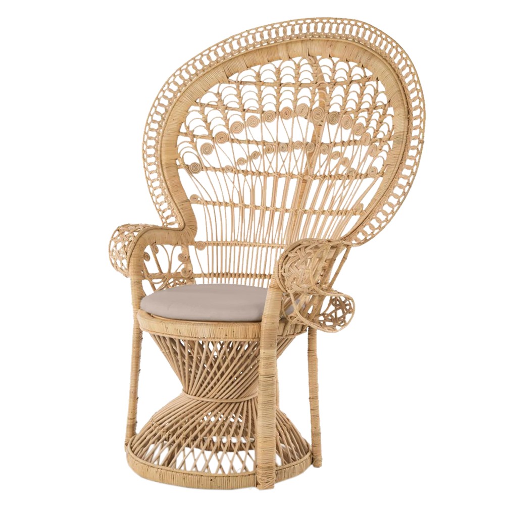 Karrige për verandë, modeli Peacock, me strukturë mbajtëse prej materiali ratani natyral (Plectocomia Elongata), me thurje të punuar në mënyrë artizanale, me përmasa 115x75x147 cm, me ndenjëse me diametër prej 65 cm, me pjesë anësore për mbështetjen e krahëve dhe me mbështetëse në formën e bishtit të palloit. Karrigia është e pajisur me shilte në formë rrethore, me veshje prej materiali poliestër, në ngjyrë të bardhë, dhe me mbushje sfungjeri të butë. Materiali përbërës i strukturës është ekologjik dhe ka përmbajtje të lartë të parenkimës bimore, gjë që e bën më elastik, më të lehtë, më fleksibël dhe më të qëndrueshëm ndaj kushteve atmosferike. Ky produkt është i përshtatshëm për dekorimin e ambienteve të jashtme në kopshte, oborre, veranda, ballkone dhe tarraca, si edhe për ambientet e jashtme të hoteleve, bar-eve, restoranteve apo pishinave.