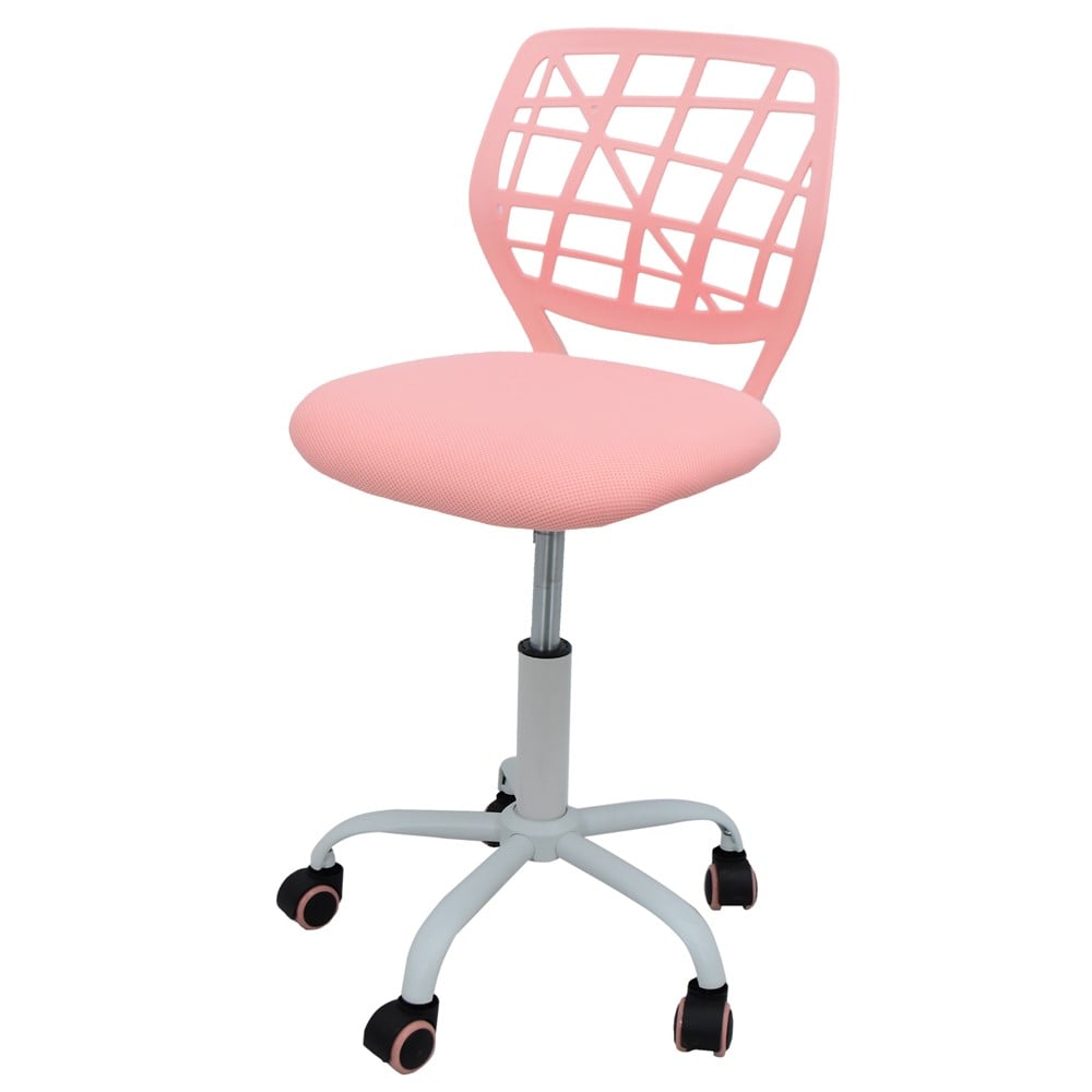Karrige zyre, strukturë metalike (bardhë), rrota najloni, ulëse tekstili (rozë), mbështetëse PP (rozë), 44x40xH74-86 cm