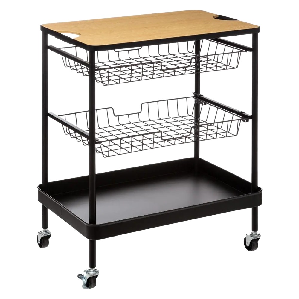 Karrocë kuzhine me 3 kate. Material çelik, ngjyrë e zezë me një sipërfaqe druri. Përmasat 60.5x40.5H79.5 cm. Ky produkt krijon një hapësirë të dobishme në kuzhinën tuaj. Ruani të gjitha gjërat tuaja në dy shporta që tërhiqen lehtë.