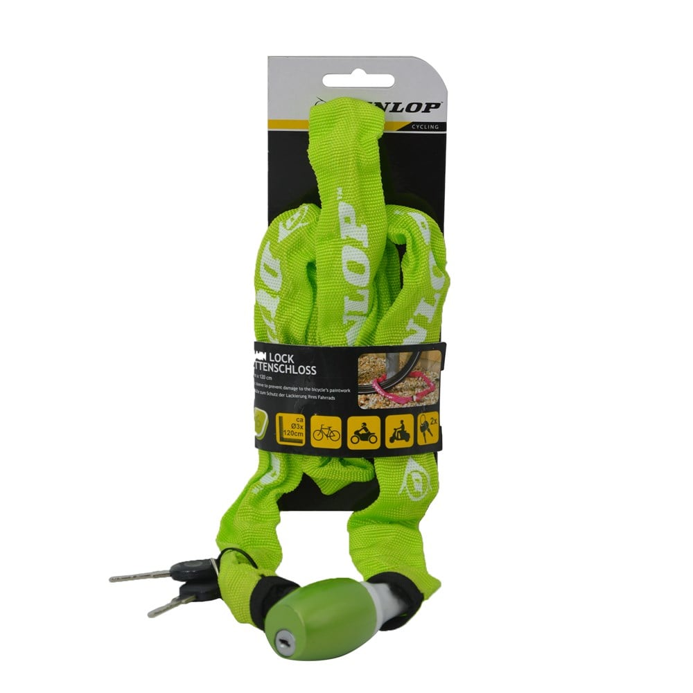 Sigurohuni biçikletën tuaj nga vjedhja e hajdutëve me këtë bllokues rrote të DUNLOP. Është e përbërë nga tela bakri e cila është e rrethuar nga një shtresë çeliku. Shtresa e tekstilit mbron zinxhirin dhe parandalon dëmtimin.