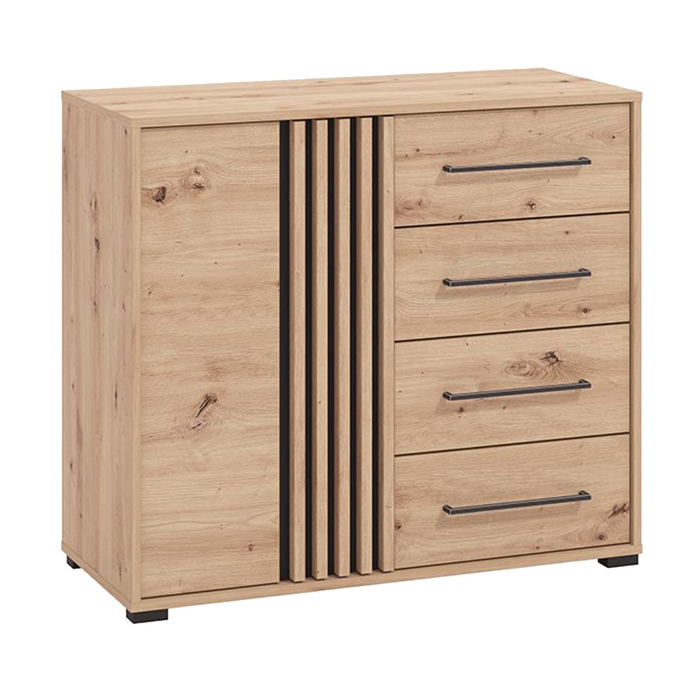 Komo Ascalon, i realizuar nga dru lisi me përfundim natyral dhe të zezë, është një zgjedhje elegante dhe funksionale për çdo hapësirë. Me përmasat 93x40xH82 cm, kjo komo ofron hapësirë të mjaftueshme për ruajtjen e sendeve, aksesorëve dhe artikujve të tjerë, duke i dhënë dhomës një pamje të rafinuar dhe moderne. Kombinimi i ngjyrës natyrale të drurit të lisi dhe nuancave të zeza krijon një efekt vizual të veçantë, duke i dhënë kësaj komoje një pamje të sofistikuar.