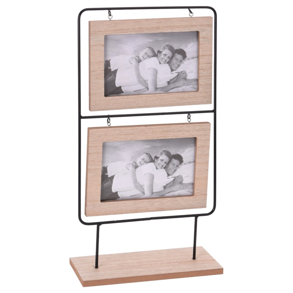 Me këtë kornizë fotografish, mund të shfaqni foto familjare ose momentet më të paharrueshme nga të gjitha udhëtimet tuaja në një mënyrë origjinale. Një stendë metalike e zezë me dy korniza 10 x 15 cm qëndron mbi një bazë drejtkëndëshe prej druri. Ato janë bërë prej druri natyral, me fibra të errëta për t'i dhënë një pamje të vjetër. Kornizat e fotografive janë të varura me një grep metalik për t'u dhënë imazheve lëvizje dhe lehtësi. Do të krijojë një dekorim shumë personal nëse e vendosni në çdo mobilje në dhomën e ndenjes ose të dhomës së gjumit.