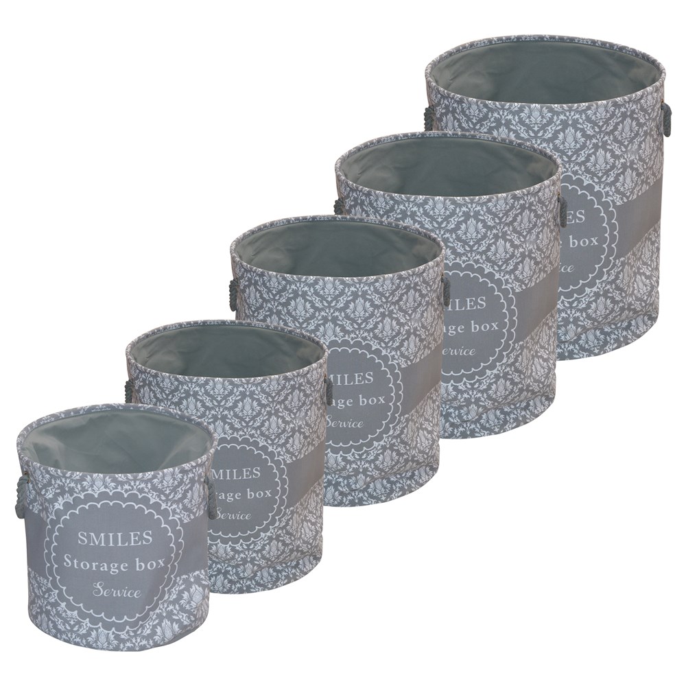 Kosh magazinimi set 5 copë, tekstil, gri, Ø35xH34 cm; Ø37.5xH47 cm; Ø40.5xH49 cm; Ø43.5xH52 cm; Ø47xH55 cm