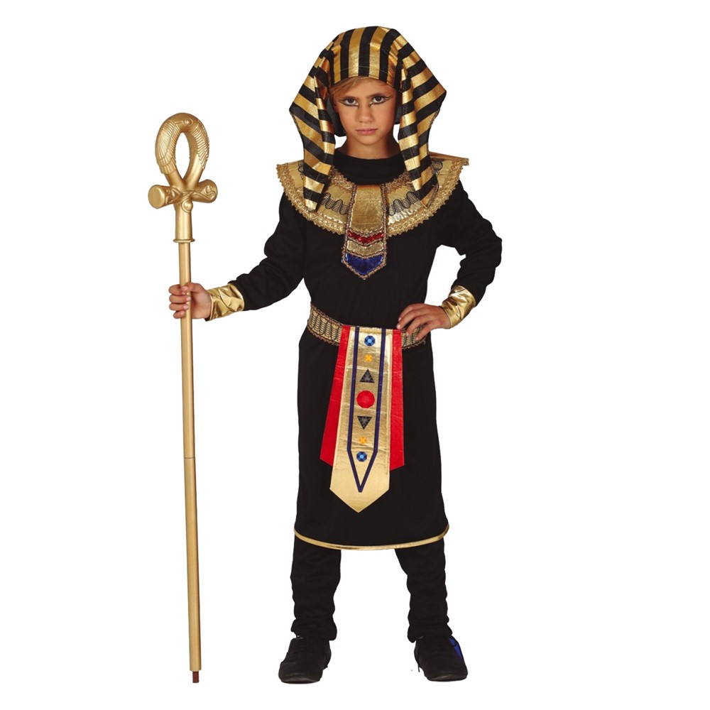 Kostum Halloween, Faraon, prej materiali poliestër. Veshja e faraonit përbëhet nga gjithsej pesë pjesë individuale: tunikë, pantallona, ​​rrip, qafë dhe mbulesë koke që përputhen.Tunika e zezë me mëngë të gjata bind me skajet e mëngës me ngjyrë ari. Veshja egjiptiane arrin rreth gjurit e cila duket jashtëzakonisht mbretërore falë gjerdanëve të mrekullueshëm prej ari dhe gërshetave të artë. Rripi harmonizohet në mënyrë të përkryer me jakën e qafës së rrumbullakët. Mosha: 10-12 vjec, Permasat: gjatësia: 142-148 cm, Gjoksi: 73-76 cm, Beli: 64-65 cm, Ijet: 75-78 cm.
