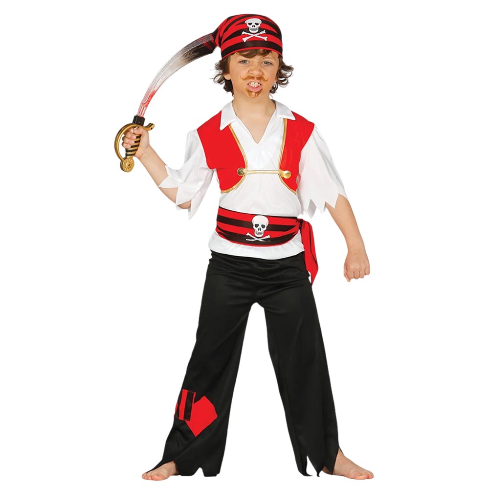 Kostum Pirate për fëmijë, prej materiali poliestre, në ngjyrë mikse. Materiali përbërës është i butë në prekje dhe nuk shkakton irritim në lëkurë. Ky produkt është i përshtatshëm për përdorim nga fëmijë të moshës 7-9 vjec me gjatësi 125 cm deri në 135 cm, bust 67-70 cm, beli 59-60 cm, ijet 67-72 cm.