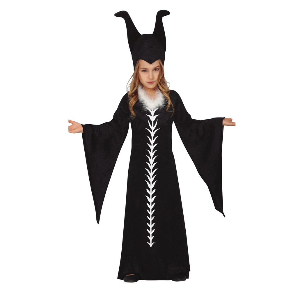 Kostum maleficent për fëmijë, prej materiali poliestre, në ngjyrë të zezë dhe të bardhë. Materiali përbërës është i butë në prekje dhe nuk shkakton irritim në lëkurë. Ky produkt është i përshtatshëm për përdorim nga fëmijë të moshës 5-6 vjeç, me gjatësi 110 deri në 115 cm. Kostumi përfshin një fustan me mëngë të gjerë dhe një kapele.