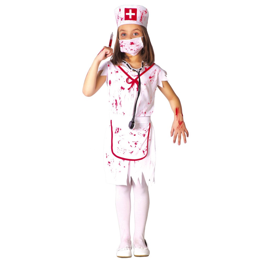 Kostum zombie nurse për fëmijë, prej materiali poliestre, në ngjyrë të bardhë. Materiali përbërës është i butë në prekje dhe nuk shkakton irritim në lëkurë. Ky produkt është i përshtatshëm për përdorim nga fëmijë të moshës 5-6 vjeç me gjatësi 110 cm deri në 115 cm .
