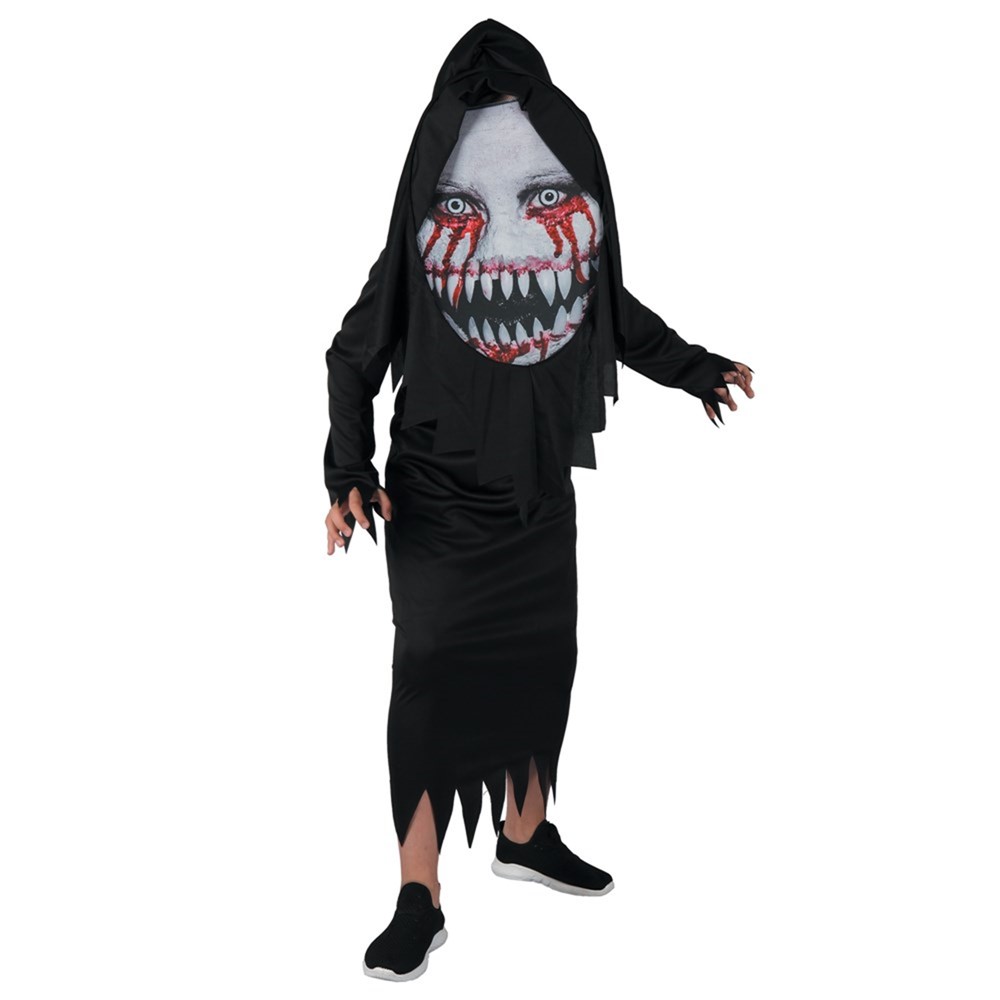 Ky kostum vjen nga ferri. Veshja është kostum perfekt prej demoni, për fëmijët që të terrorizojnë shokët mashtrues ose keqtrajtues! . veshja është e përbërë nga një pëlhurë e zezë me mëngë të gjata, kapuc të bashkëngjitur.