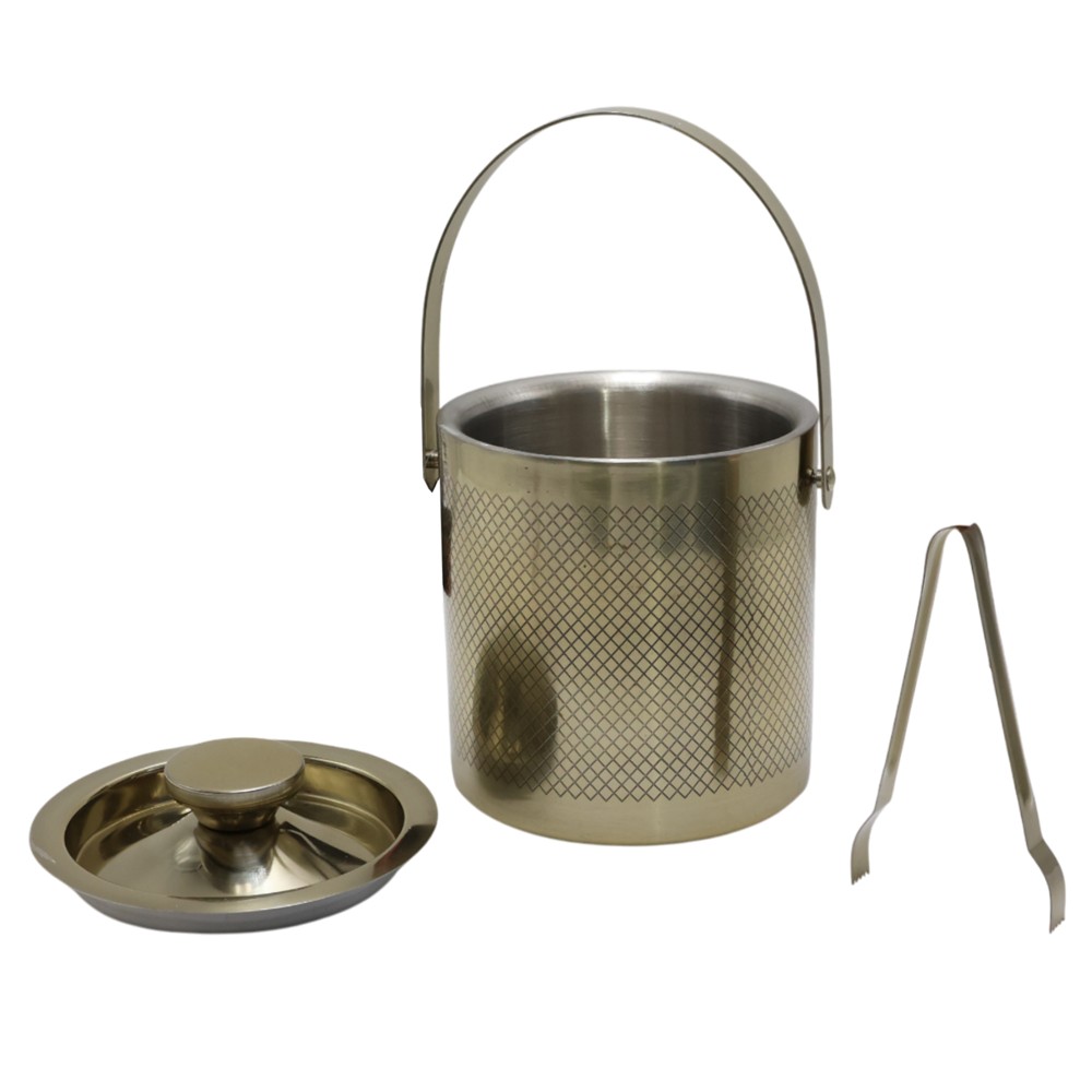 Kovë akulli prej inoksi me ngjyrë floriri, me përmasa Dia. 15 x H 18.5 cm. Kjo kovë akulli elegante dhe e qëndrueshme është perfekte për mbajtjen e akullit të freskët për pije, kokteje ose raste speciale. Materiali prej inoksi siguron përdorim afatgjatë, rezistencë ndaj korrozionit dhe pastrim të lehtë, ndërsa përfundimi floriri i jep një pamje luksoze dhe të sofistikuar çdo ambienti.