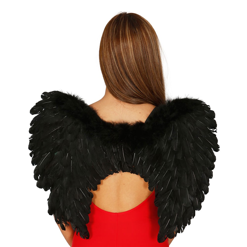 Krahë engëlli, me pendë, në përmasë 60x45 cm, në ngjyrë të zezë. Ideale për të qenë një engjëll me krahë të zinj. Krahët kanë rrip nga të dyja anët për tu vendosur në krahë.