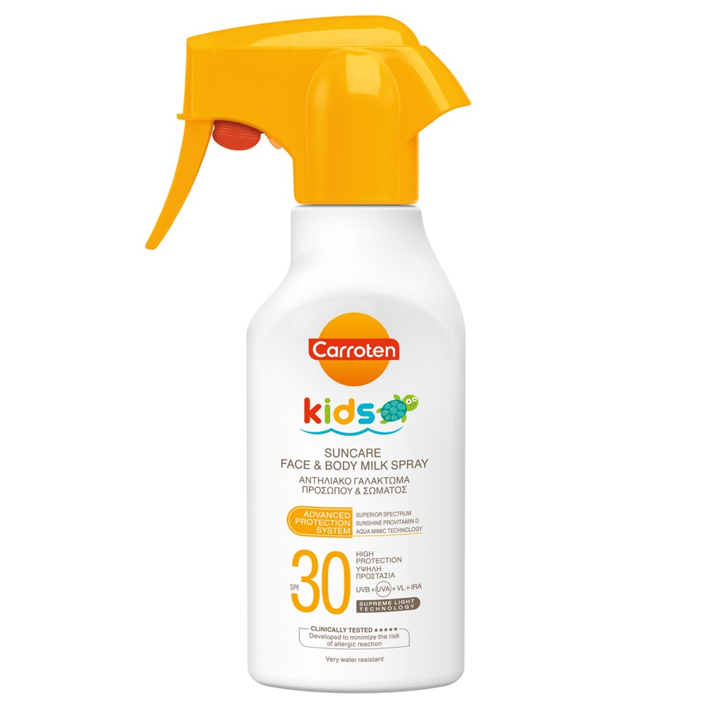 Krem brojtes, Carroten Kids, për fytyrë dhe trup për fëmijë, SPF30, 270 ml, në formën e një sprej, ofron aplikim të lehtë dhe mbrojtje të shtuar për lëkurën, duke synuar gamën më të gjerë të të gjitha rrezeve të diellit. I pasuruar me Beta-Glukan, stimulon mbrojtjen e sistemit imunitar të lëkurës së ndjeshme të fëmijëve, duke e mbrojtur atë në mënyrë efektive nga faktorët e jashtëm agresivë që shkaktojnë acarim dhe Provitamin D për të forcuar mbrojtjen e saj kundër rrezatimit UV, me mbrojtje mbrojtës 4-fish i përmirësuar UVB+UVA+VL*+IRA. I testuar dermatologjikisht/Rezistent ndaj ujit. Aplikojeni në mënyrë të barabartë një sasi të bollshme në të gjithë trupin, para ekspozimit në diell dhe riaplikoni shpesh, veçanërisht pas notit, fshirjes me peshqir dhe djersitjes.
