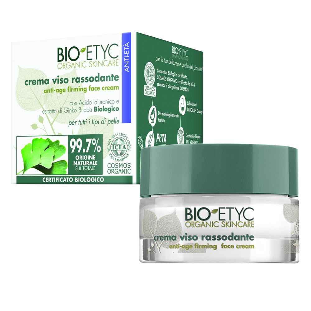 Krem për fytyrën Bioetyc Organik kundër plakjes 50ml. Krem dite dhe nate, i përshtatshëm për të gjitha llojet e lëkurës. Teksturë e pasur por jo e yndyrshme që përthithet shpejt, ofron një efekt forcimi në fytyrë. Veprim efektiv i përgjithshëm kundër plakjes, zvogëlon shfaqjen e rrudhave. I pasuruar me acid hialuronik me një veprim hidratues dhe mbushës, rikthen elasticitetin e lëkurës. I formuluar me një agjent ngritës dhe ekstrakte të trëndafilit organik dhe xhinko biloba, ofron një veprim ngritës dhe reduktimin e rrudhave. Aplikojeni në mëngjes dhe në mbrëmje në fytyrë dhe qafë me një masazh të lehtë. Ideale si bazë grimi. Testuar dermatologjikisht.