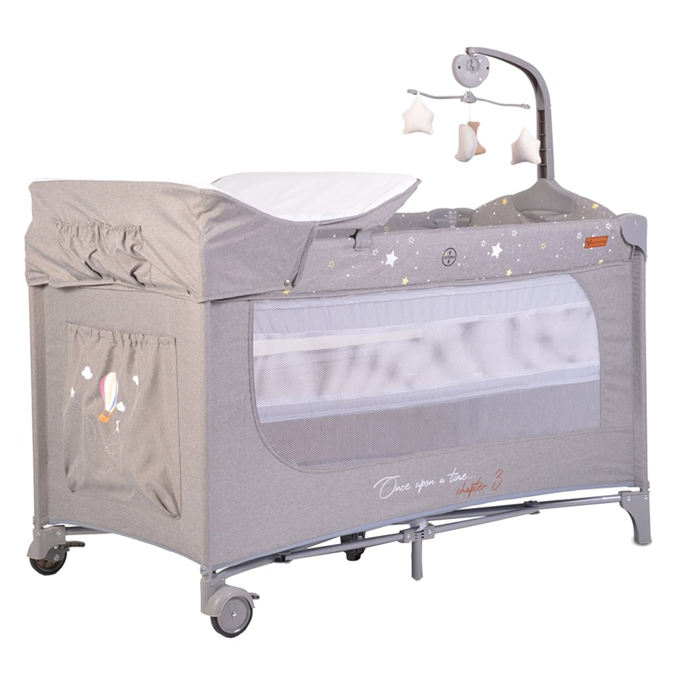 Krevat portativ me dy nivele, me strukturë mbajtëse të përbërë nga material alumin dhe plastik të qëndrueshëm dhe veshje prej materiali poliestre antialergjike dhe antibakteriale. Krevati ka një hapje anësore me zinxhir, sistem të palosjes, një lojë me avrje, dhe një çantë mbajtëse. Mund të përdoret si krevat për fëmijë, si kënd lojërash dhe si krevat portativ lehtësisht i palosshëm dhe kompakt për t'u marrë me vete në udhëtime. Ky produkt është i përshtatshëm për fëmijë të moshës 6 - 36 muajsh, me peshë deri në 15 kg.