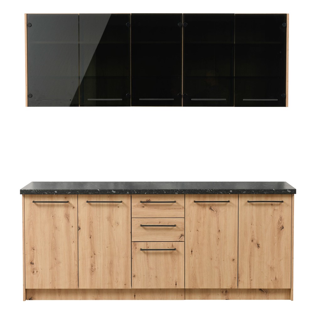 Kuzhina ADELA, në një kombinim të ngjyrës së lisit dhe xhamit të errët, përfaqëson një koncept modern dizajni inovativ në pajisjet e kuzhinës. Është projektuar për të përmbushur kërkesat funksionale dhe estetike në pajisjen e brendshme të kuzhinës, por edhe për të kontribuar në estetikë. Modulet e varur teke dhe të dyfishta, si dhe elementët e poshtëm të dyfishtë, por edhe elementët me sirtarë funksionalë, ofrojnë hapësirë të mjaftueshme për ruajtjen e enëve, dhe një kontribut të veçantë në kuzhinën ADELA jep xhami i errët përmes të cilit bie në sy ndriçimi LED, i cili është një përfitim shtesë.