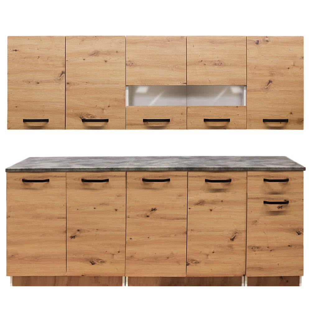 Kuzhinë Ria është një produkt i ndërtuar nga materiale cilësore si melamina, dhe ka një pamje të pastër në ngjyrë neutrale. Gjatësia totale e kësaj kuzhine është 200 cm, duke përfshirë të gjitha komponentët e saj. Kjo kuzhinë është e dizajnuar për të ofruar një hapësirë të mjaftueshme për gatimin, përgatitjen e ushqimit dhe shërbimin e ushqimit. Përveç funksionalitetit, ajo ofron një estetikë të stilizuar që do të përshtatet lehtësisht me dizajnin e brendshëm të shtëpisë suaj. Me sirtare dhe dollape të mjaftueshëm për ruajtjen e enëve të gatimit, ushqimit dhe pajisjeve të kuzhinës, kjo kuzhinë do të jetë një shtesë e shkëlqyeshme për ambientin tuaj.