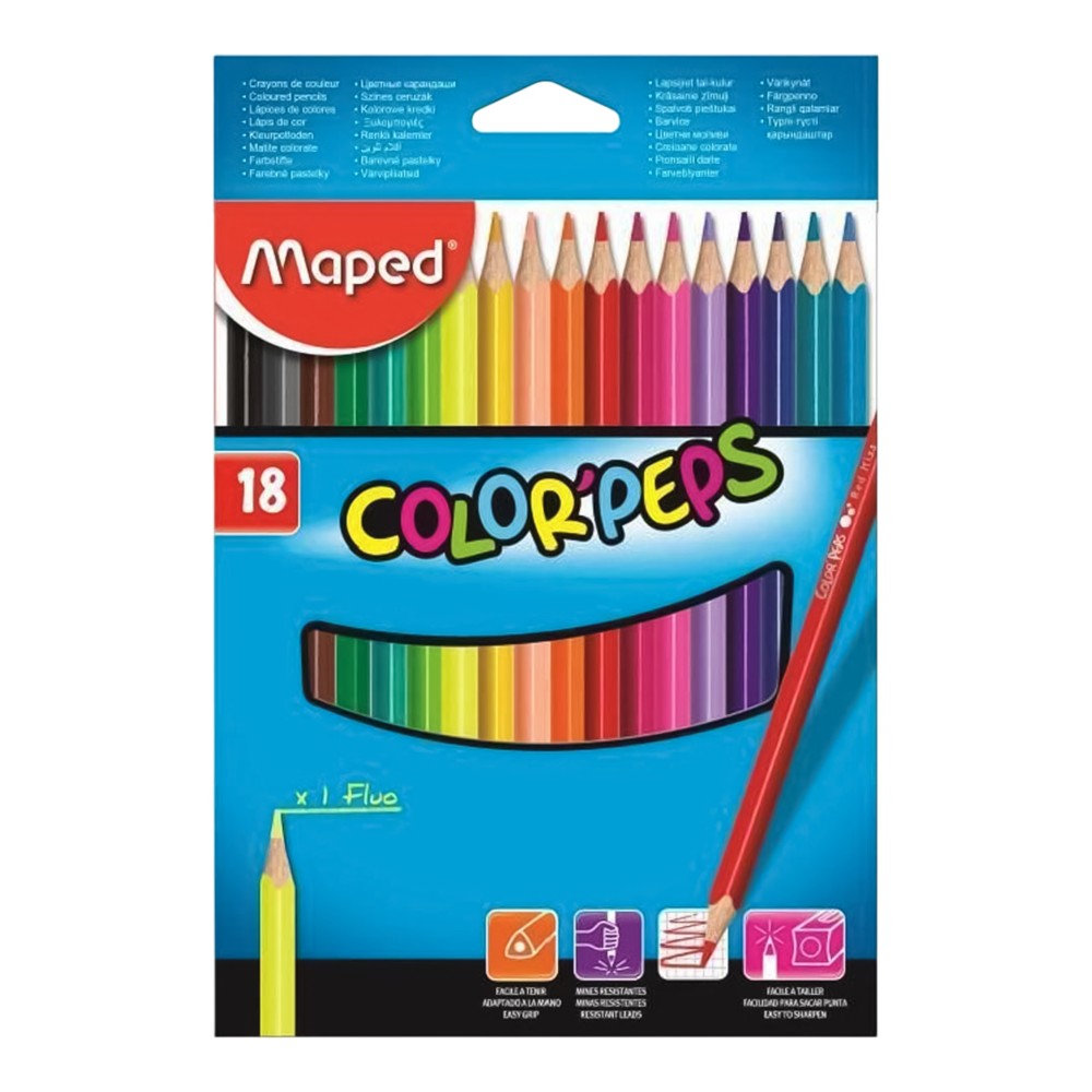 Me 18 ngjyra të ndritshme, të gjalla dhe të lehta për t'u mprehur, Lapsi me ngjyra i Maped Colorpep është emëruar sipas ngjyrës së treguar në trupin e lapsit, përveç që ka një formë trekëndore, ka një plumb rezistent dhe të butë, i cili lehtëson kapjen.