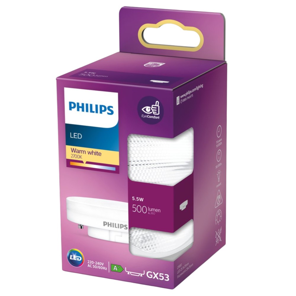 Llambë LED Philips 5.5W me bazë GX53, dritë të ngrohtë 2700K dhe fluks ndriçimi 500 lumen. Ofron ndriçim të këndshëm dhe efikas energjikisht, ideale për përdorim në spote ose ndriçues të integruar.