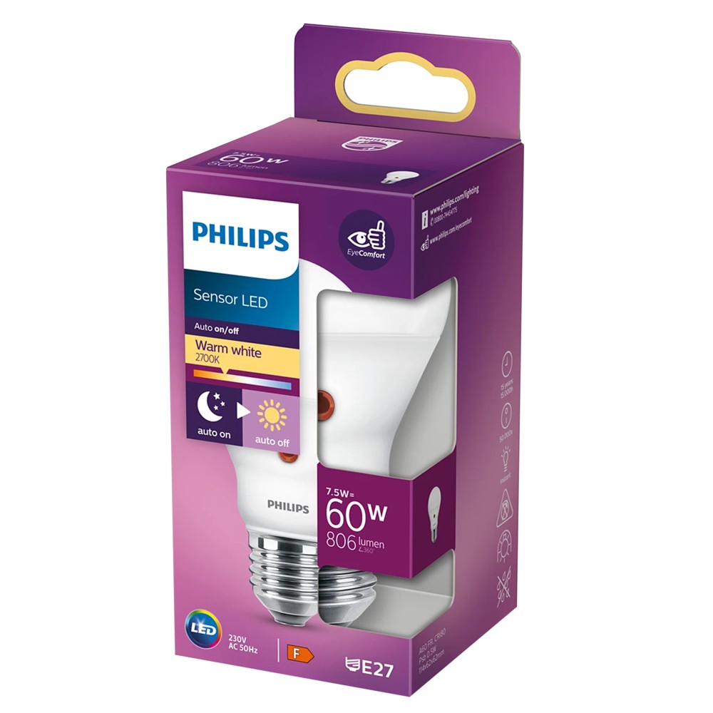 Llambe led, Philips, me sensor muzgu, 60W, 2700 K, A60, E27. Krahasuar me cdo tip llambe tjetër llambat LED janë më ekonomike, kanë një intesitet të lartë drite, janë më jetgjata dhe avantazhi kryesor i këtyre llambave që i bën ato mjaft të përdorshme është eficenca e lartë e ndricimit .Fluksi i dritës i prodhuar nga këto llamba jep një renderizim mjaft të qartë të ngjyrave.