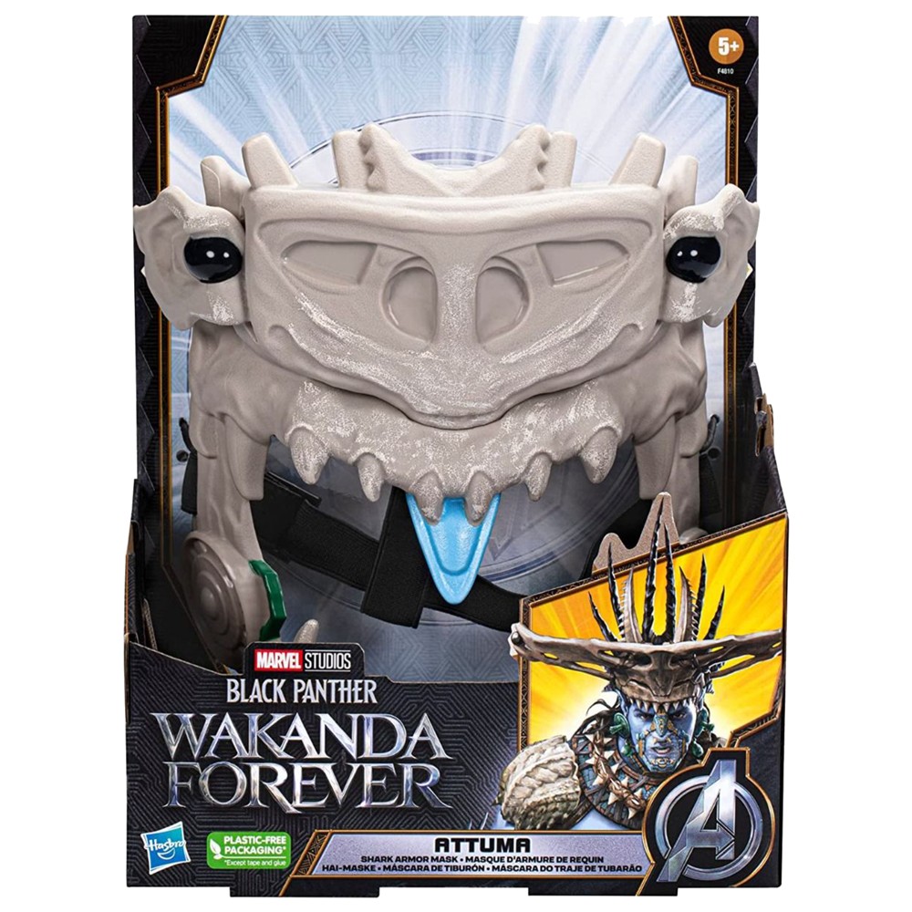 Përgatituni për një betejë me imagjinatë nënujore si Attuma me këtë maskë armaturë të peshkaqenit Black Panther Wakanda Forever Attuma! Fëmijët e moshës 5 vjeç e lart mund të luajnë si luftëtarë duke mbajtur maskë vetëm ose duke aktivizuar anët e saj të zgjatura për një pamje të ashpër të peshkaqenit me kokë çekiç.
