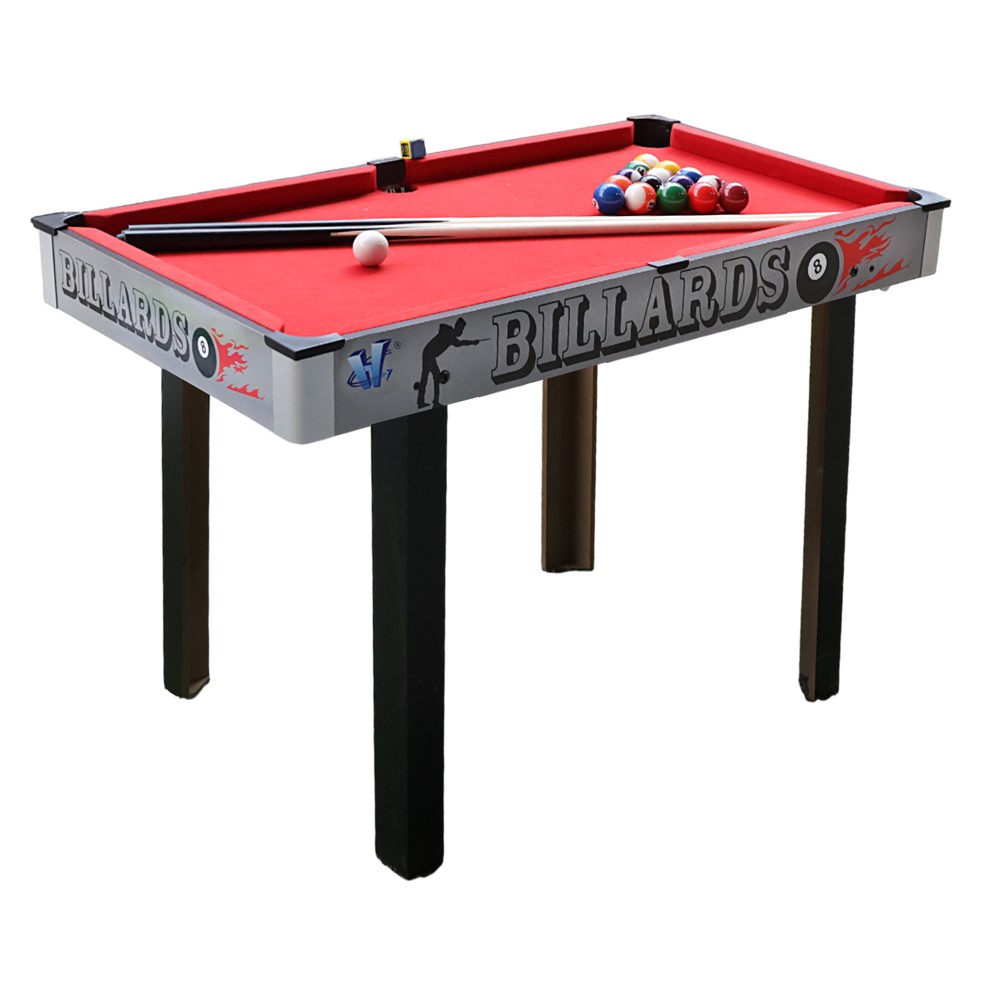 Kjo tavolinë bilardo do të përshtatet në mënyrë të përkryer me çdo ambient tuajin. Ju mund të kënaqeni duke luajtur në të në çdo kohë dhe çdo moment. Materiali i strukturës është MDF. Përmasat e tavolinës janë 91 x 51 x 64 cm dhe është i përshtatshëm për 2 lojtarë