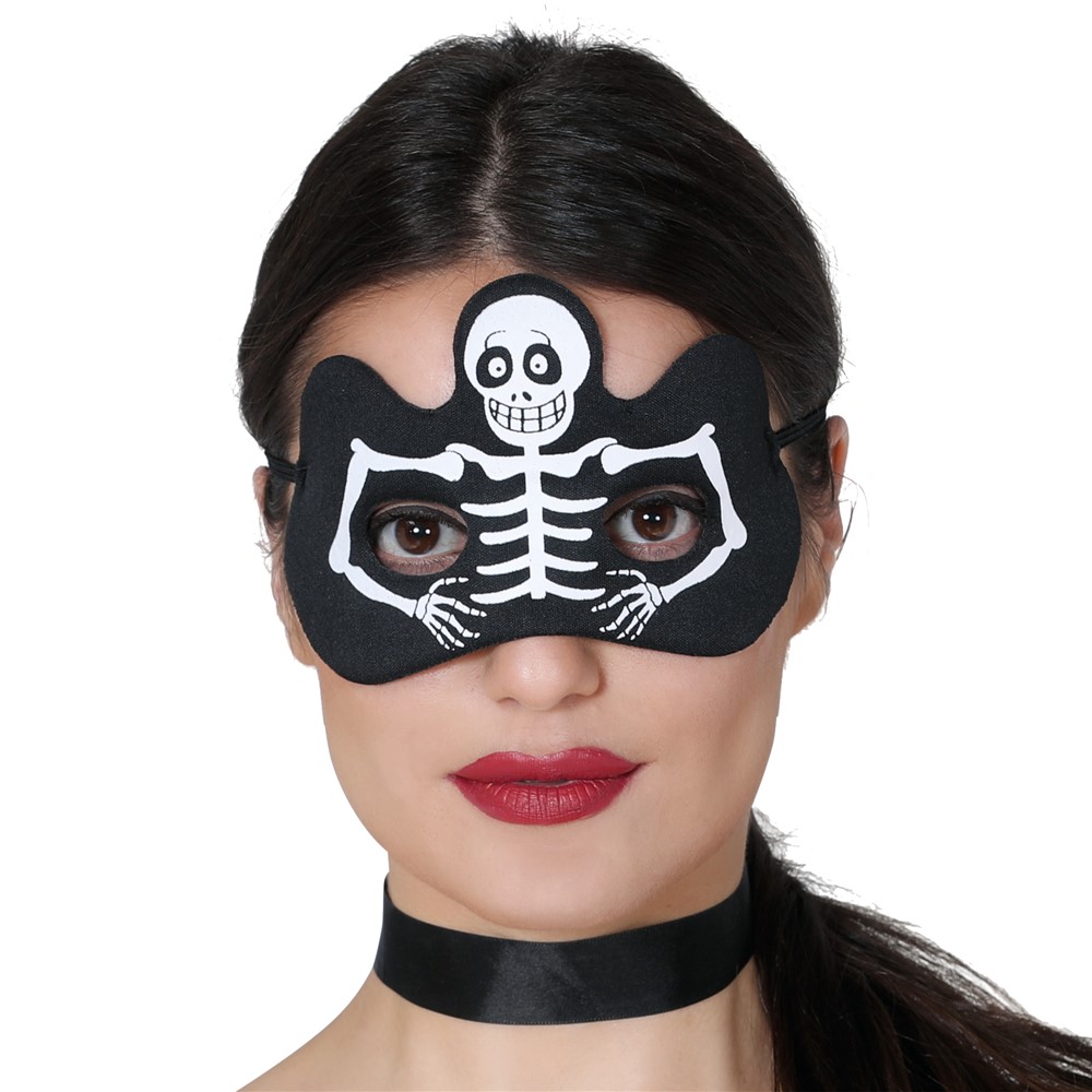 Maskë për sytë, prej materiali poliestër dhe plastik në ngjyrë të zezë me të bardhë me skeleton. Idelale për të kombinuar veshjen e skeletonit me ktë maskë.
