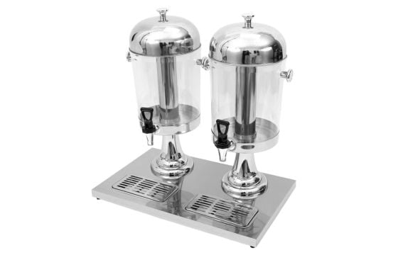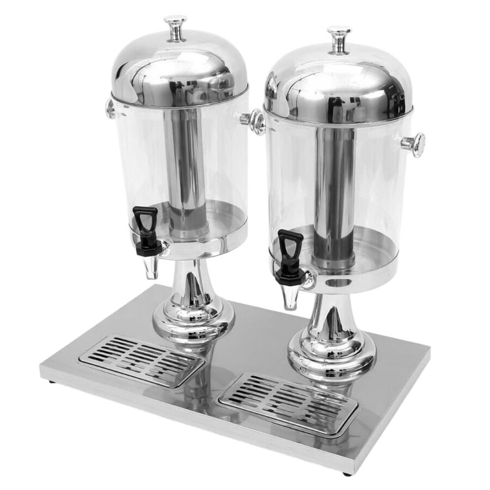Kjo mbajtëse lëngjesh dyshe është një pajisje elegante dhe funksionale, e dizajnuar për të shërbyer dy lloje lëngjesh të ndryshme njëkohësisht në hotele, restorante, bufete dhe evente. Me kapacitetin e saj të dyfishtë prej 10 litrash (5 litra për çdo kontejner), ajo ofron një zgjidhje praktike për shërbimin e lëngjeve në sasi të mëdha. Dy kontejnerë të veçantë për dy lloje lëngjesh. Kombinim i inoksit (çelik inox) dhe pleksiglasit, duke siguruar qëndrueshmëri, higjienë dhe transparencë. Materialet e lehta për t'u pastruar sigurojnë higjienë maksimale dhe përdorim të sigurt. Mekanizmi i shpërndarjes së lëngjeve është i thjeshtë dhe i lehtë për t'u përdorur, duke minimizuar humbjet dhe rrëmujën. Pamja e pastër dhe transparente lejon klientët të shohin lëngjet brenda. E përshtatshme për lëngje të ndryshme si lëng portokalli, lëng molle, ujë, etj.