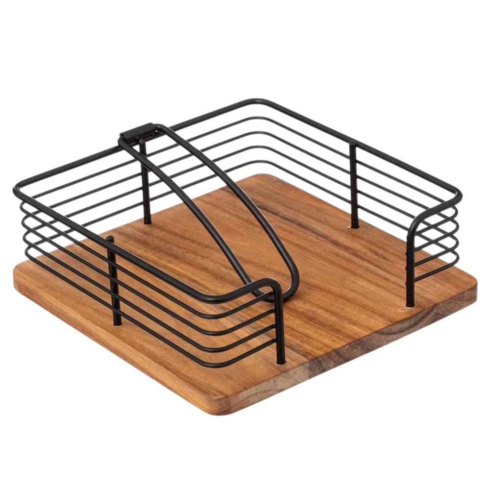 Kjo mbajtëse për letër kuzhine, prej çeliku dhe druri, në ngjyrë të zezë dhe kafe, është ideale për të mbajtur letër kuzhine të organizuar dhe të aksesueshme. Me përmasat 19 × 19 × 7 cm, është kompakte dhe përshtatet lehtësisht në banak ose raft, ndërsa materiali i qëndrueshëm ofron stabilitet dhe përdorim afatgjatë.