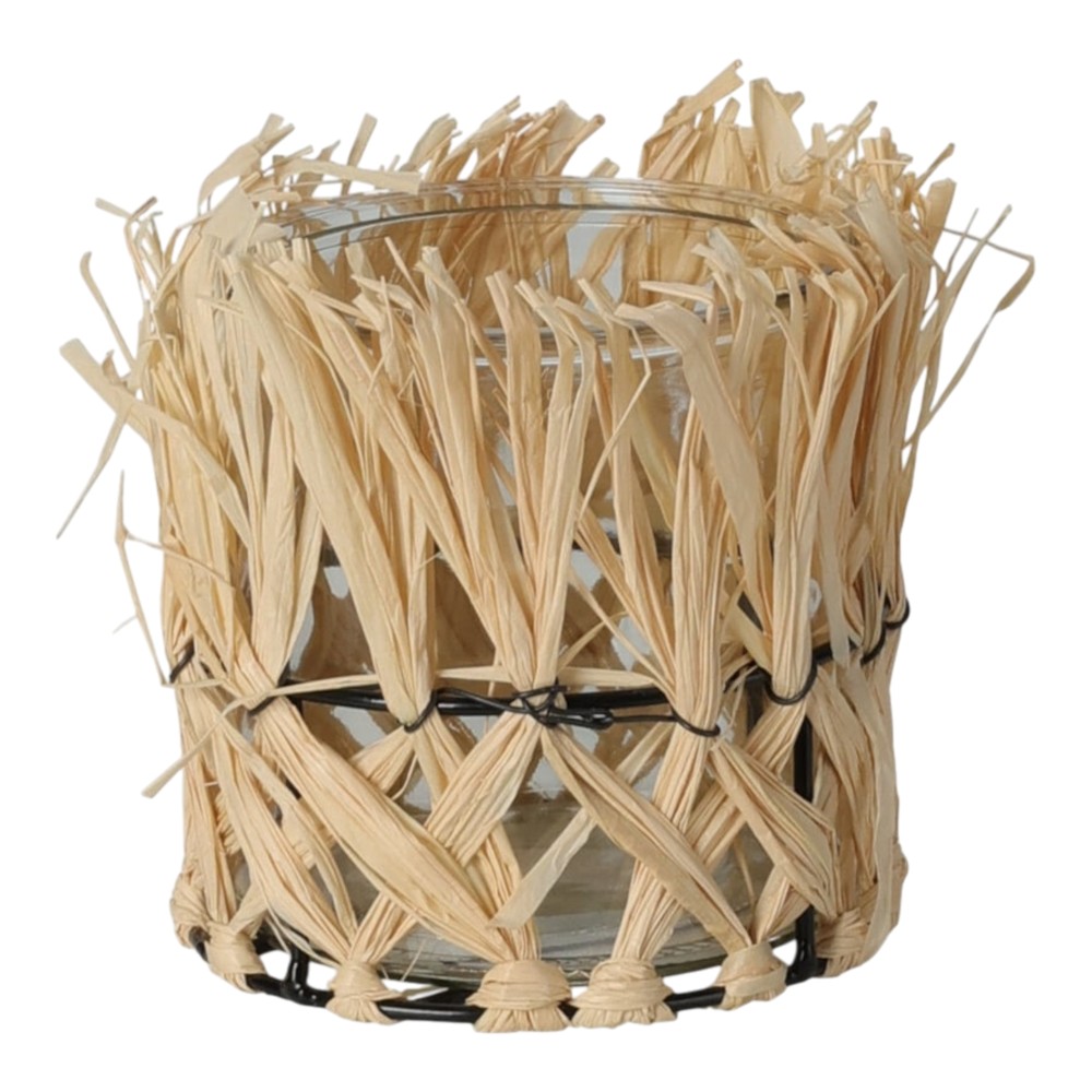 Një mbajtëse qiriri elegante dhe e këndshme për dekorimet tuaja të tavolinave por edhe rafteve. Në material qelqi dhe me fije kashte, është një ndërthurje me shumë stil që i shton një prekje unike të veçantë. E punuar mjeshtërisht ajo është jo vetëm funksionale por edhe një dekor estetik shumë i bukur. Mbajtësja e qiritrit ka një diametër 10x10 cm.
