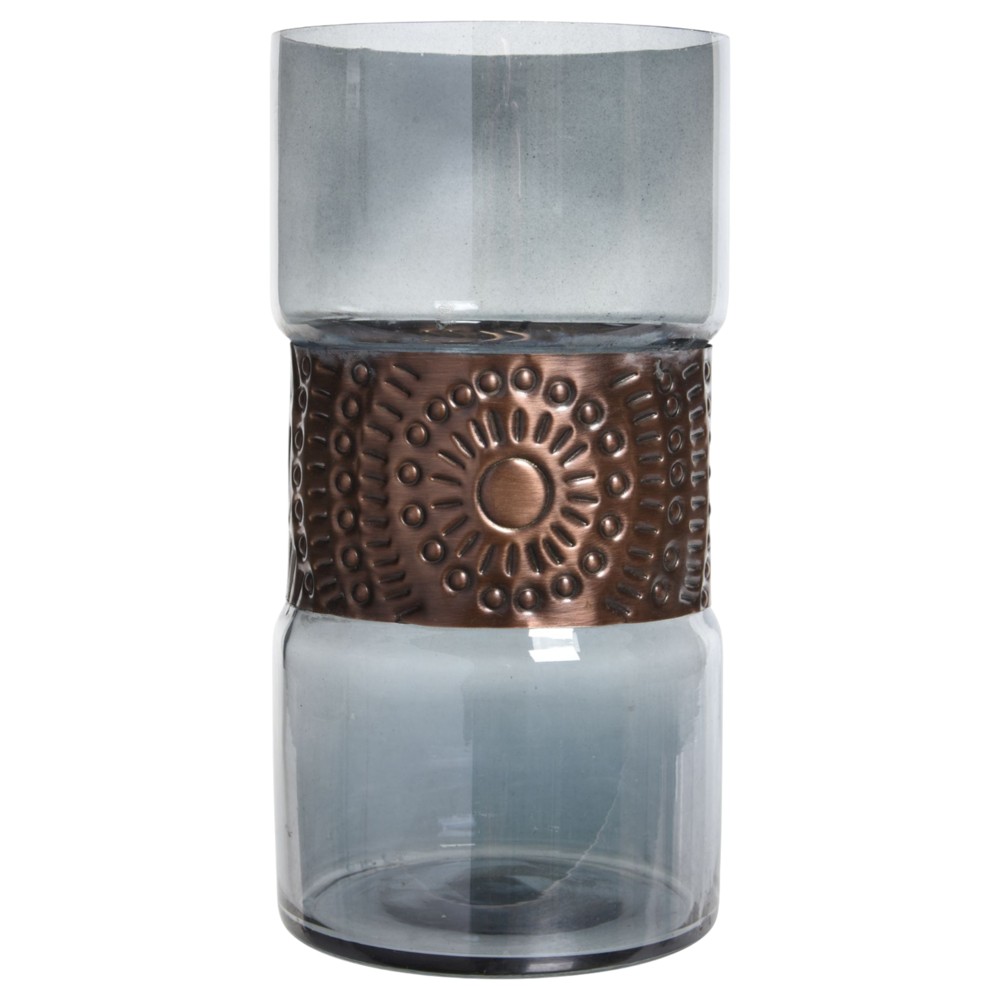 Kjo mbajtëse elegante për qirinj është realizuar nga qelq transparent dhe e zbukuruar me një rrip dekorativ prej metali me motive të gdhendura në ngjyrë bronzi. Kombinimi i materialeve krijon një kontrast të veçantë duke i dhënë mbajtëses një pamje të sofistikuar dhe artistike. Forma cilindrike dhe përmasat Dia.12xH25 cm e bëjnë atë të përshtatshme për qirinj të mëdhenj, ndërsa dizajni i saj unik e bën një element dekorativ që tërheq vëmendjen.