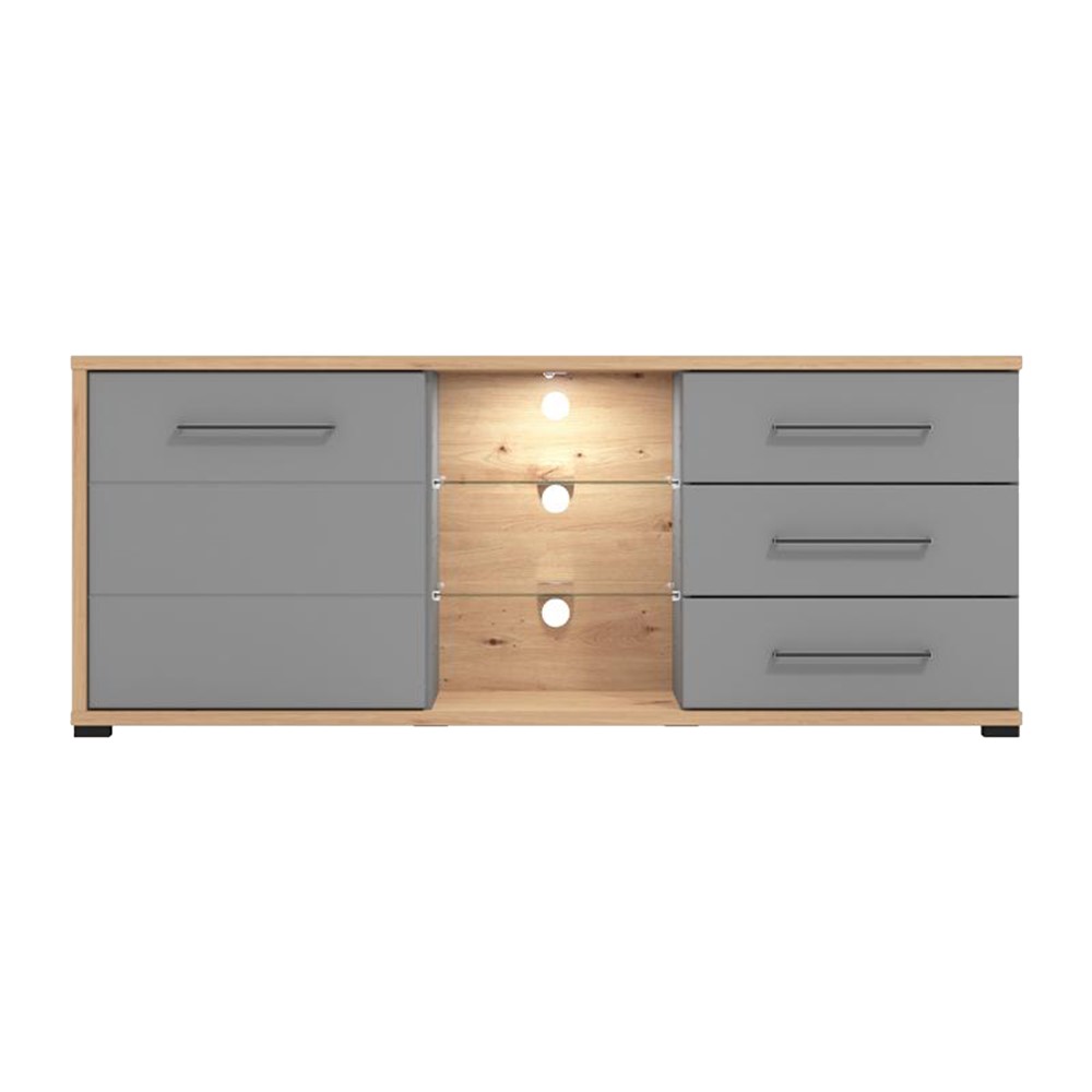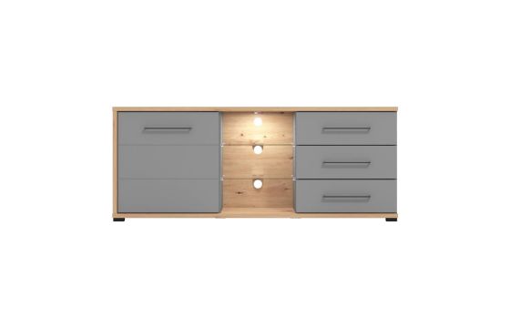 Rafti i televizorit LISBON në një kombinim të dekorit artizanal të lisit, fletë metalike gri grafit dhe gri mat, është një zgjidhje tërheqëse dhe estetikisht e këndshme për dekorimin e ambientit të shtëpisë. Hapësira e shfrytëzueshme përbëhet nga sirtarë praktik në pjesën qendrore, një ndarje e hapur dhe një e mbyllur, të cilët kanë praktikisht të rregulluar rafte për ruajtje. I përket sistemit eponim të elementeve LISBON, i cili është një zgjidhje konceptuale projektuese për arredimin e ambientit të plotë të dhomës së ndenjes. Linja e saktë gjeometrike që ndjek dizajnin e kësaj serie elementësh është e harmonizuar me dizajnin e thjeshtë të dorezave që mbështesin drejtimin e dhënë të stilit. Ekziston mundësia e ndriçimit shtesë, i cili mund të kontribuojë në theksimin e estetikës së të gjithë ambientit. Kodet e linjës Lisbon: 243223, 243224, 243225, 243226