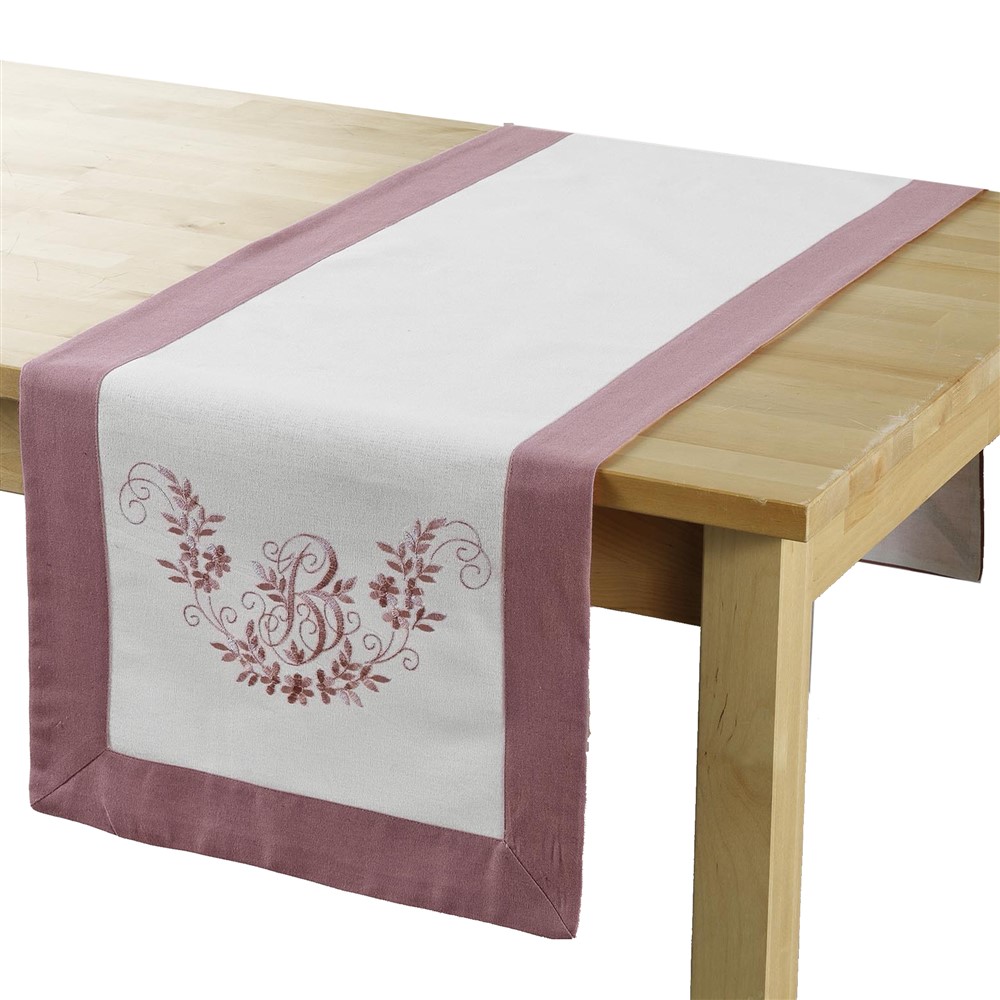 Mbulesë tavoline me qëndisje BONHEUR, 60 % poliestër / 30 % pambuk, e bardhë / rozë, 40 x 140 cm