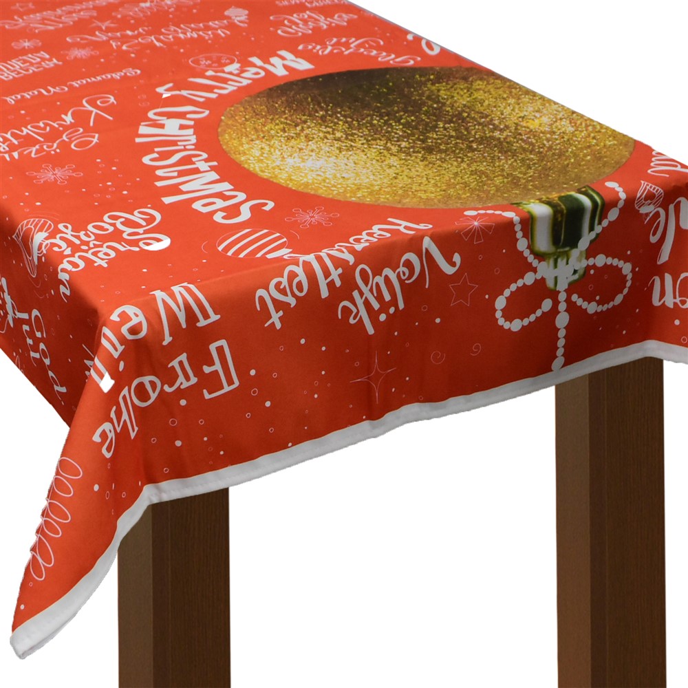 Mbulesë tavoline në formë drejtkëndore, prej materiali 65% pambuk dhe 35% poliestër, me përmasa 135x170 cm, me dizajn Krishtlindjesh me figura 3D në ngjyra të ndryshme. Përdoret si një objekt dekorativ dhe funksional, për shtrimin e tavolinave për 6 persona, gjatë festave të Krishtlindjes dhe Vitit të Ri. Materiali përbërës është rezistent ndaj larjeve, nuk përthith yndyrën apo njollat dhe nuk mban rrudha, gjë që e bën më të lehtë larjen dhe hekurosjen. Ky produkt është i përshtatshëm për përdorim në ambiente të brendshme jo-profesionale dhe mund të lahet lehtësisht në lavatriçe në një temperaturë deri në 40°C, për të ruajtur butësinë dhe ngjyrën e materialit.