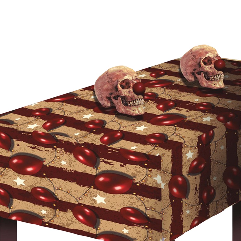 Mbulesë tavoline prej materiali plastik, me dizenjo kllouni, në përmasë 137x274 cm. Ideale për dekorin e tavolinës për festën e halloween.