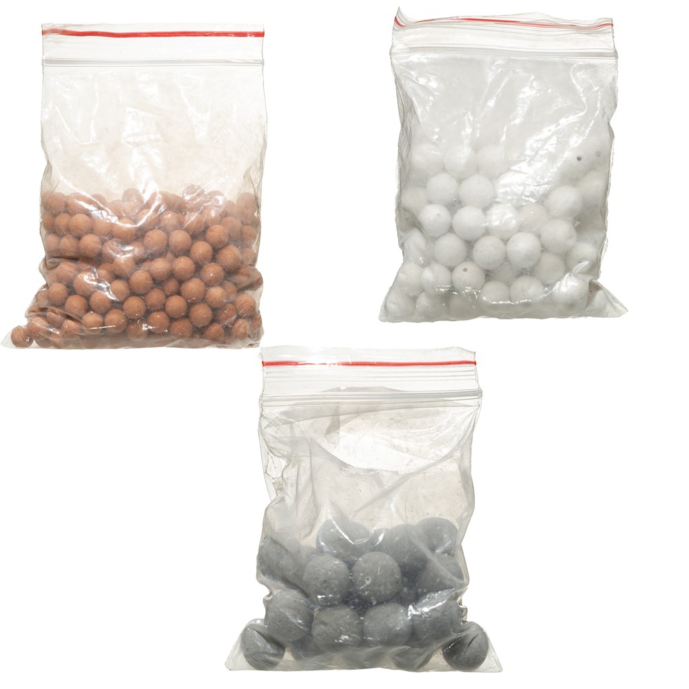 Sfera filtruese uji, prej materiali argjile ose mermeri, të cilat përdoren për rimbushjen e kokës së dushit me depozitë filtrimi dhe janë të pasura me minerale që lejojnë filtrimin e ujit dhe balancimin e elementëve natyralë në përbërjen e tij. Seti përmban 3 paketime me sfera filtruese minerale në ngjyra të ndryshme. Ky produkt është i përshtatshëm për përdorim me kokën e dushit me depozitë filtrimi (kodi 224722).