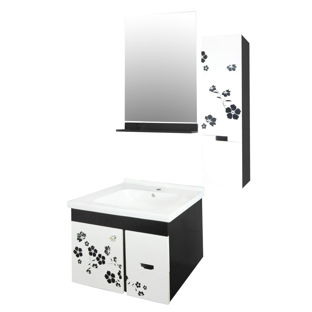 Seti i kompletuar i mobilieve të banjës “Flora” prezanton dizenjon elegante që gjallëron tualetin tuaj.Materiali PVC ofron rezistencë të lartë ndaj lagështirës dhe lehtësi për t’u pastruar duke siguruar një pamje të bukur, që zgjat.Ngjyra e bardhë e mobilieve me dekorin e zi kompozohet shumë mirë në ambiente me pllaka moderne njëngjyrëshe të ngjyrave si e zeza,e bardha, grija, etj.Seti përfshin lavamanin, dollapin poshtë tij, pasqyrën dhe dollapin anësor, të gjitha të paketuara për një montim shumë të thjeshtë dhe të shpejt nga kushdo.Me këtë set, ju mund të rimodeloni herë pas here ambientin vetëm me zhvendosjen e dollapit anësor me varje në mur, duke shfrytëzuar maksimalisht hapësirat dhe duke sjellë gjithmonë risi dhe argëtim në shtëpinë tuaj.