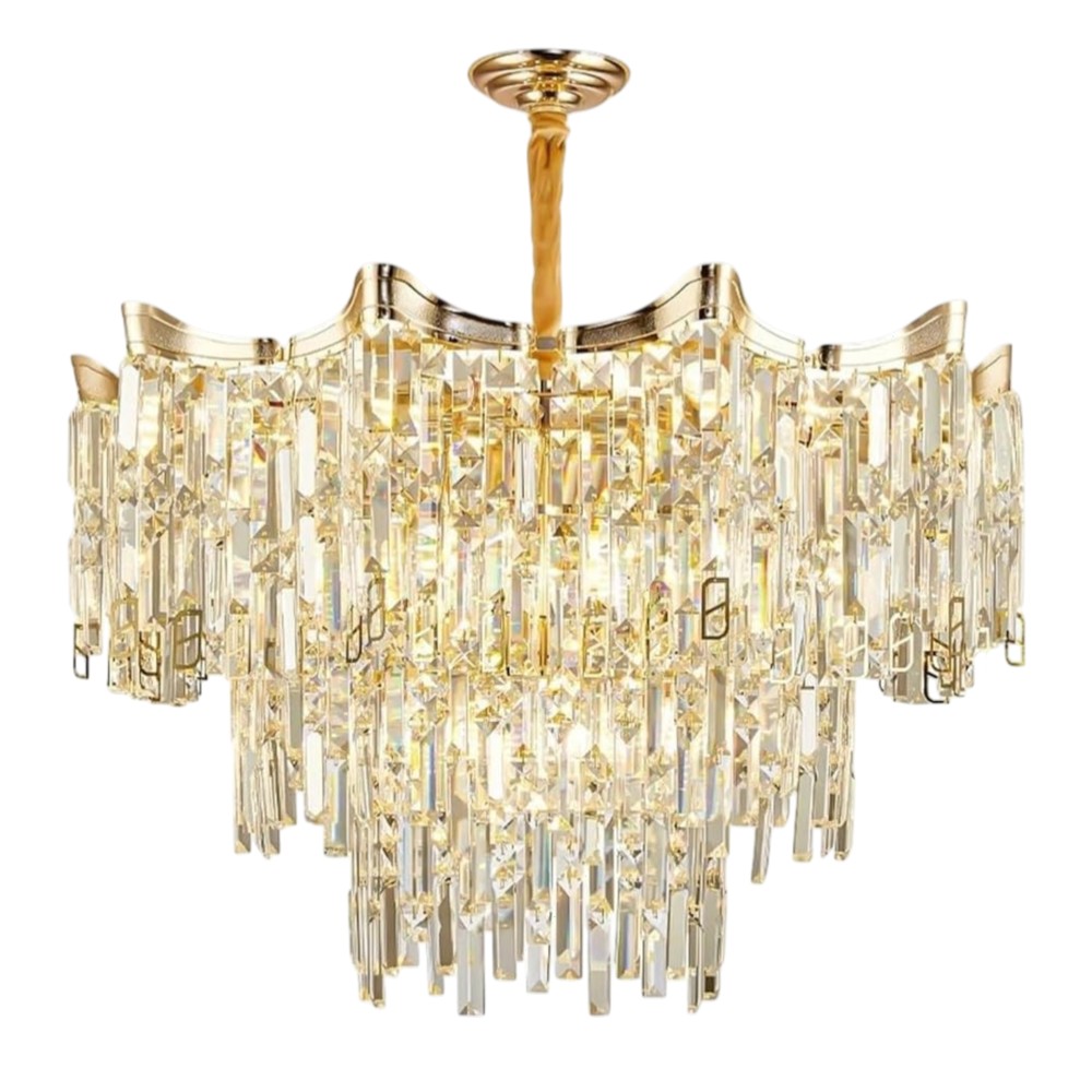 Ndriçues i varur me dizajn luksoz, i pajisur me 12 portollamba E14. Ka diametër 60 cm dhe është i realizuar nga metal dhe kristal me përfundim gold, duke krijuar ndriçim elegant dhe atmosferë prestigjioze për ambientin.