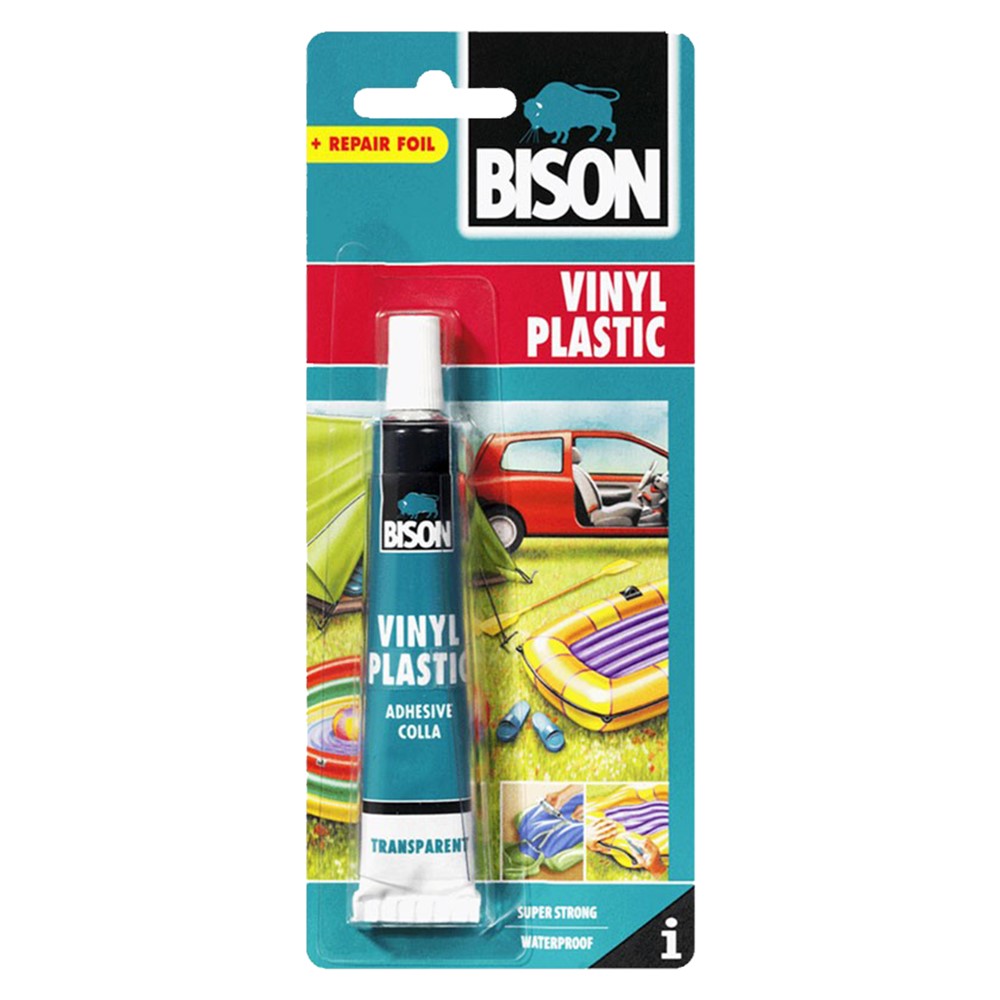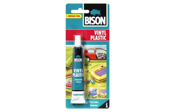 Ngjitësi i plastikës, Bison është super i fortë, i papërshkueshëm nga uji dhe transparent kur thahet. I përshtatshëm për plastikë të butë, vinyl, PVC të butë dhe lëkurë artificiale. Ideale për riparimin e varkave me fryrje, shtretërve dhe pishinave, mushamave PVC, tendave, pëlhurave, perdeve të dushit, mbulesave të sediljeve, shtretërve me ujë, veshjeve të pellgjeve dhe rripave. Ngjitësi nuk është i përshtatshëm për fletë PE. Fleksibël kur thahet.