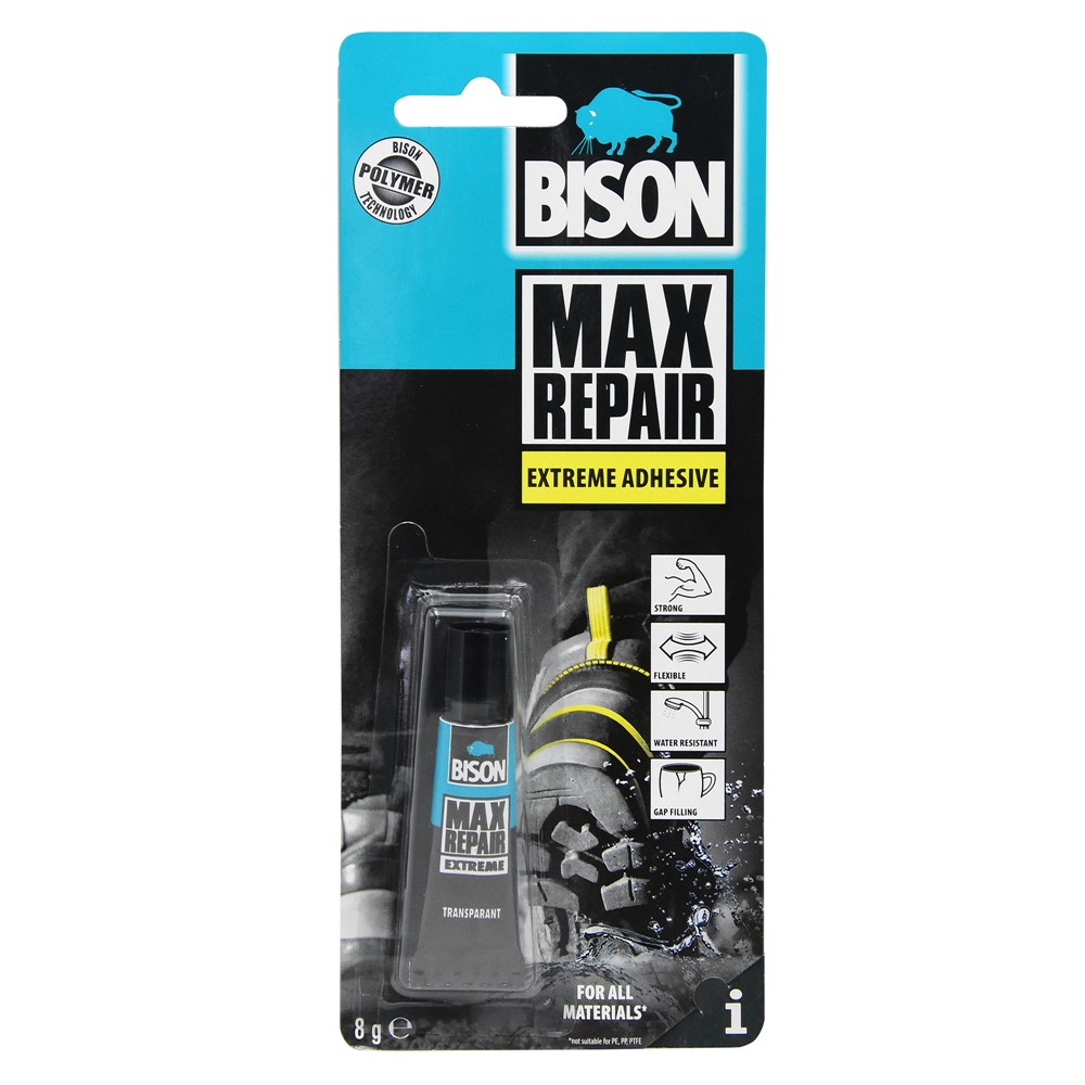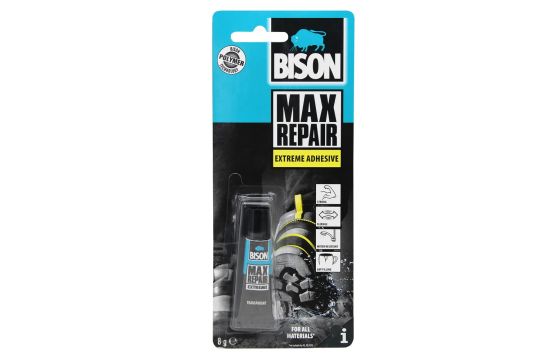 Max Repair Extreme është një ngjitës jashtëzakonisht i fortë për riparimin e materialeve poroze dhe jo poroze si druri, tekstili, lëkura, tape, metali, qelqi, plastika, goma, pllaka qeramike, guri, çimento dhe shumë materiale të tjera. I përshtatshëm për perdorim brenda dhe jasht. Max Repair Extreme bazohet në Teknologjinë Bison Polimer. Produktet e bazuara në këtë teknologji garantojnë një zgjidhje universale, të fortë, fleksibël, afatgjatë, të sigurt dhe miqësore për përdorimin e përditshëm. Jo i përshtatshëm për Polipropilen (PP), Polietilen (PE) dhe P.T.F.E.