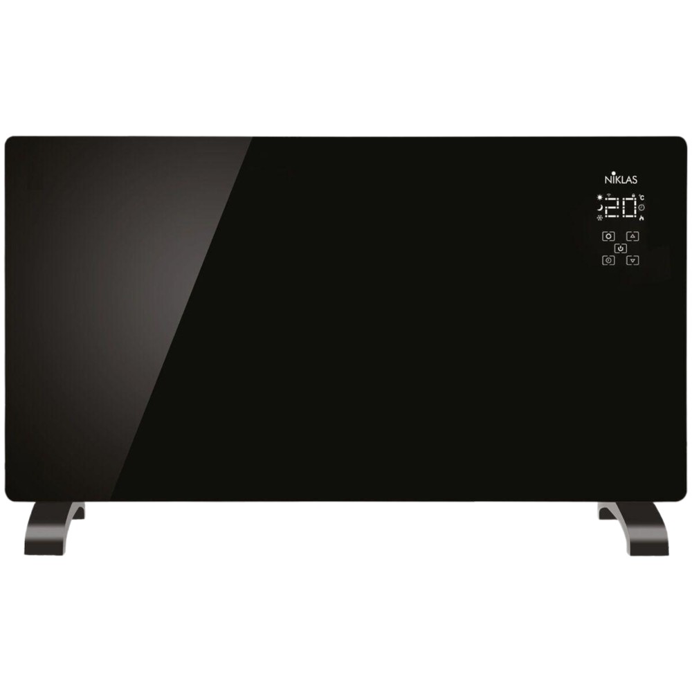 Ngrohës elektrik Niklas. Fuqia 2000 W, panel xhami i temperuar, element ngrohje alumini, ekran LED, kohëmatës 24-orësh me telekomandë, termostat me sensor elektronik, funksion mbrojtje nga ngrica, mbrojtje nga mbinxehja, termostat i ambjenti. Montim ne mur ose në dysheme. IP24. Përmasat 82x12xH52 cm.