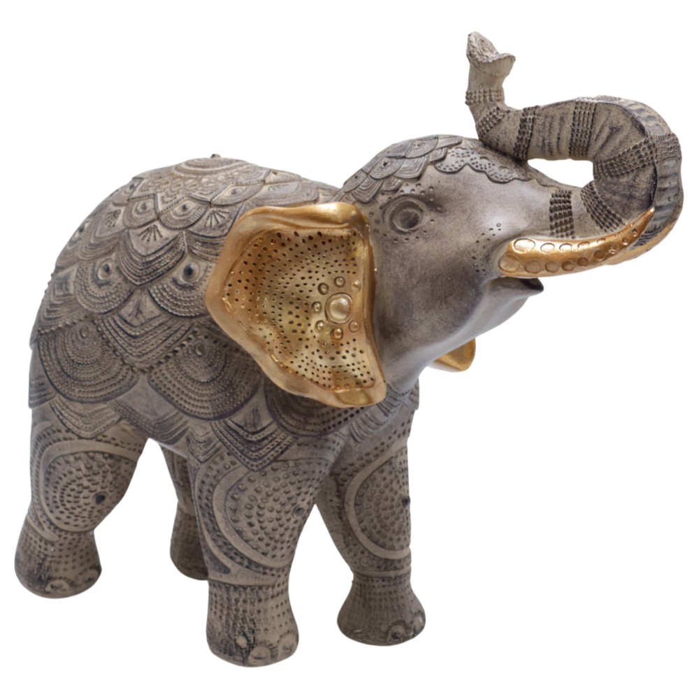 Statuja dekorative në formën e një elefanti është një objekt dekorues që do të shtojë një pamje të sofistikuar në dekorimet tuaja. Mund ta përdorni në hapsira të ndryshme të rafteve apo edhe tavolinave. Përshtatet shumë mirë me dekoret e një stili oriental dhe ka njhë kombinim pperfekt të ngjyrave që të jep idenëe një objekti dekroues antik. Vjen me një ngjyrë të florinjtë në disa pjesë të tij, që i shtojnë një prekje luksoze. Dekoroni ambientet tuaja me shije dhe me klas falë këtij objekti që ju lidh drejtpërdrejtë me natyrën. Vjen e punuar në material rezine dhe në përmasat 32x13xH29 cm.