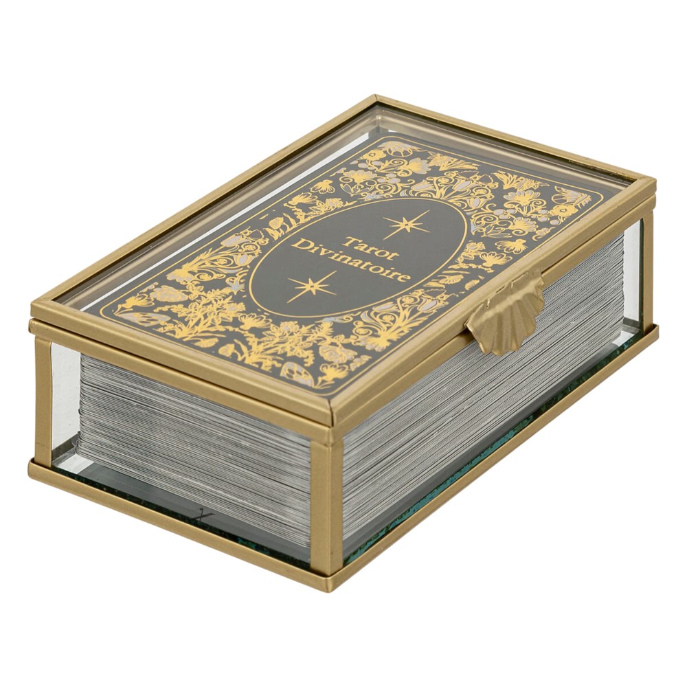 Eksploroni artin e divinacionit dhe vetëzbulimit me Kartat e Tarotit të dizajnuara me bukuri. Pavarësisht nëse jeni një lexues i përvojshëm tarot ose një fillestar kurioz, ky set është mjeti perfekt për t'u lidhur me intuicionin tuaj, për të fituar qartësi dhe për të reflektuar mbi udhëtimet e jetës. Seti përbëhet nga letrat dhe nga kutia prej xhami. Perfekte për përdorim personal dhe si një dhuratë të menduar, këto karta tarot do të përmirësojnë praktikën tuaj shpirtërore dhe do të ofrojnë një kuptim më të thellë të botës përreth jush. Përveç funksionit mund ti përdorni dhe për dekor në ambientin tuaj.