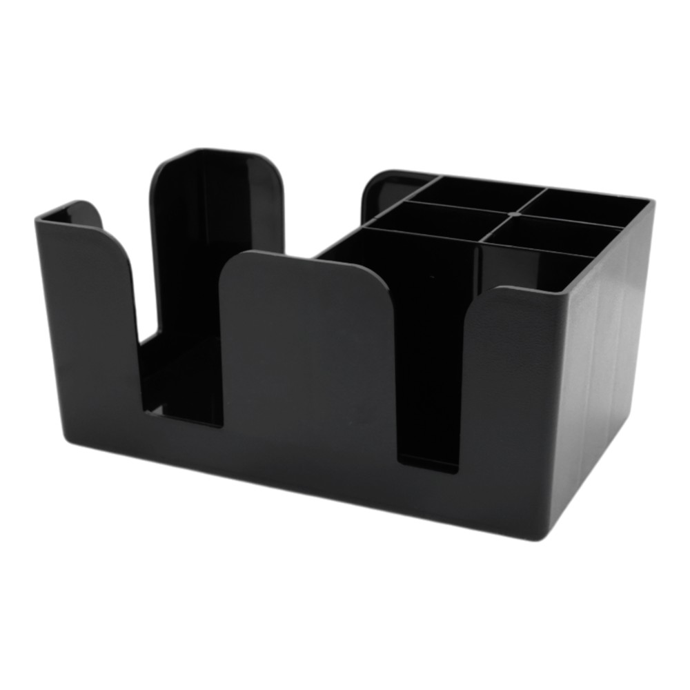 Ky organizues bari, i bërë nga plastikë e qëndrueshme dhe në ngjyrë të zezë, është një zgjidhje praktike për të mbajtur të organizuara dhe të arritshme të gjitha aksesorët e nevojshëm për shërbimin e pijeve në bar. Me përmasat e tij kompakte, ai përshtatet lehtësisht në çdo sipërfaqe bari, duke ndihmuar në mbajtjen e një ambienti të pastër dhe të organizuar.