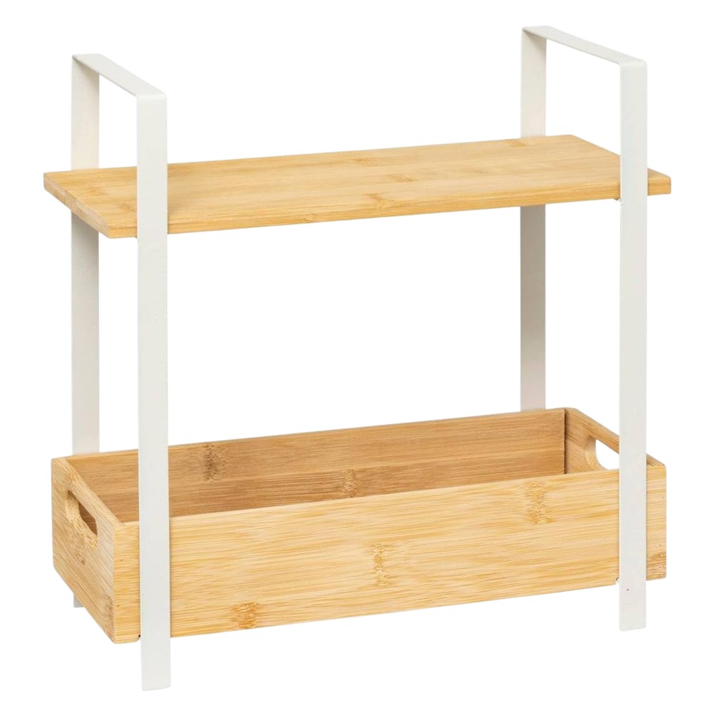 Ky organizues me 2 kate Ordera, prej çeliku dhe bambu, kombinon funksionalitetin me një dizajn të ndritshëm dhe modern. Me ngjyrat natyrale dhe të bardhë, është ideal për ruajtjen e enëve, kavanozëve ose produkteve të tjera në mënyrë të organizuar. Me përmasat 30 × 14 × 30 cm, ofron hapësirë të bollshme në dy nivele dhe materiali i qëndrueshëm siguron përdorim afatgjatë.