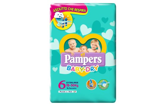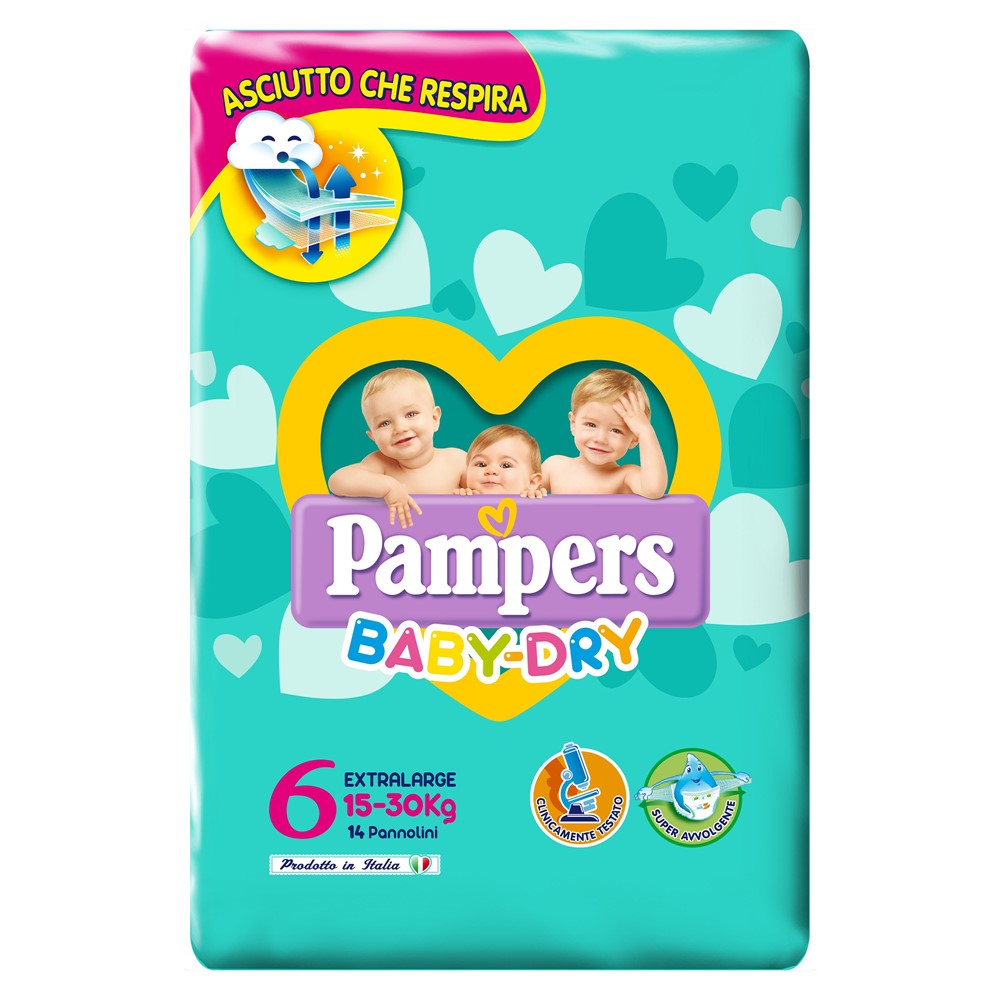 Panolina për bebe, Baby Dry, Pampers, pambuk, XL, nr. 6, 15-30 kg, 14 copë, me ngjitëse