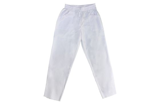 Pantallonat e kuzhinjerit në ngjyrë të bardhë janë mjaft të rehatshme dhe praktike. Kanë veçori të nevojshme që përfshijnë: llastikun në pjesën e belit, ngjyra e tyre e bardhë do të bëjë që higjena e kuzhinës tuaj të jetë në standartet me të larta. Me një dizajn të thjeshtë për një përshtatje bashkëkohore. Kanë një pëlhurë rezistente e cila lejon veshjen të mbajë formën e saj pas çdo larje. Pantallonat janë në masën XXL. Mos përdorni zbardhues. Mos përdorni makineri tharëse. Përdorni temperaturë hekurosje mesatare.