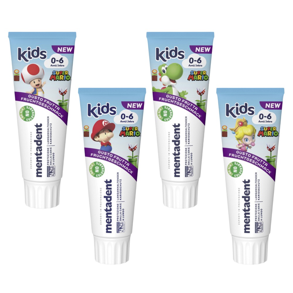 Pasta e dhëmbëve Mentadent Super Mario Kids është e dizajnuar për fëmijët nga 0 deri në 6 vjeç. Me një formulë të butë dhe të sigurt, ajo pastron dhëmbët e vegjël pa irrituar mishrat e gojës, duke ofruar mbrojtje kundër kariesit. Me aromë të këndshme dhe paketim argëtues me karakteret e Super Mario, kjo pastë e bën pastrimin e dhëmbëve një aktivitet të këndshëm për fëmijët.